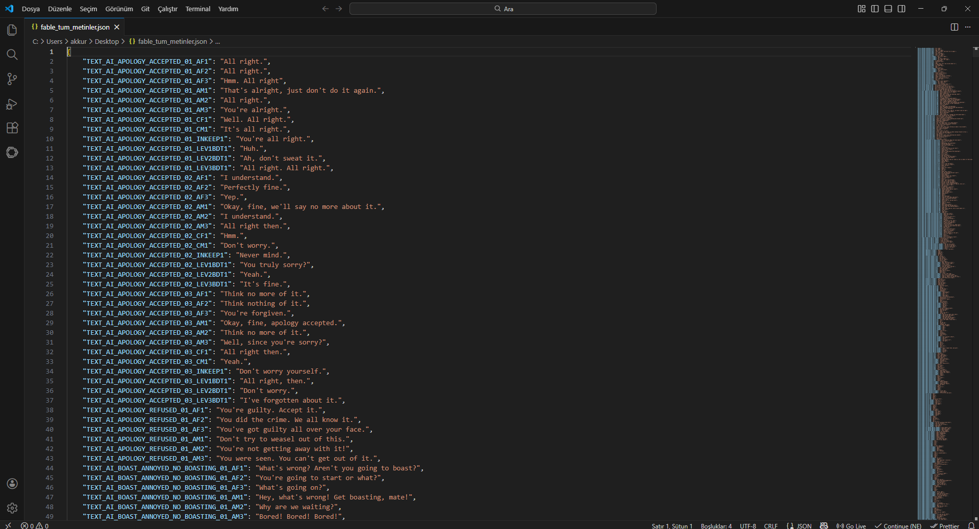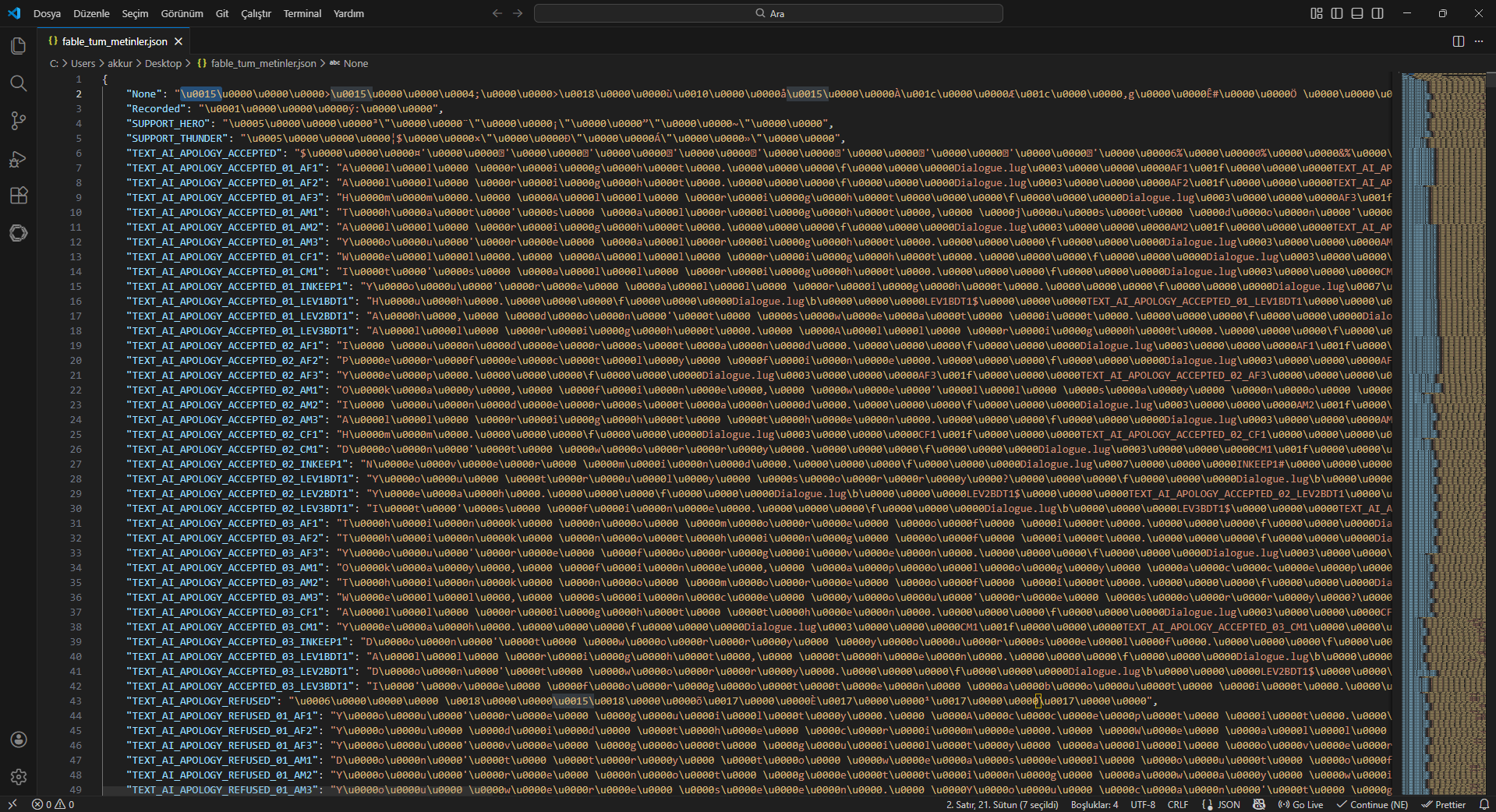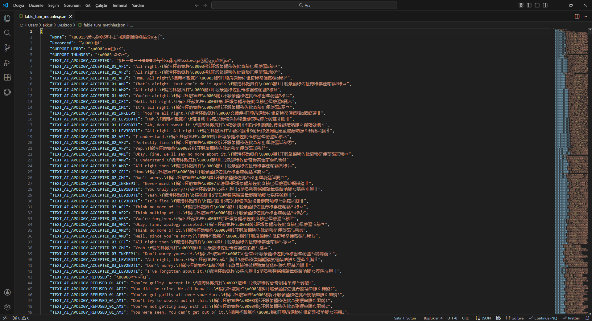 Bir şeyler denedim, biraz kurcalayıp test ettim ama bir şeyler yanlış ya da bozuk gibi duruyor. Hafta sonu tekrar bakıcam. Yama yapılmasın diye ellerinden geleni yapmış gibiler. < Resime gitmek için tıklayın > Düzenleme: Gerçek ve tam metinlerini çıkardım ama aralardaki taglarla ilgili sorun var onlarla ilgili birşey bulmaya çalışıyorum. Bu arada yamayı ben yapıyorum diyemem şuanda sadece test ediyorum belki oyunda kelime sınırı vardır eğer o varsa pırt. düzeltme: Bişeyler bişeyler < Resime gitmek için tıklayın > < Resime gitmek için tıklayın > < Resime gitmek için tıklayın > |
