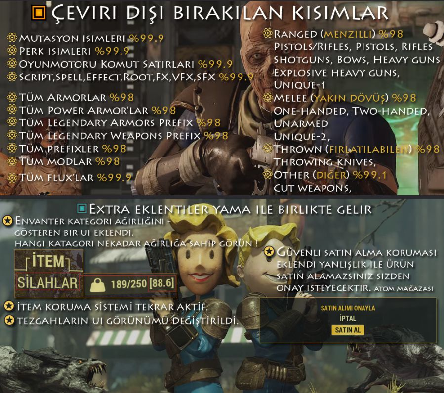 Makine çeviri olduğunu nerden çıkardın 5 aydan fazladır çeviriyorum ben bu yamayı ! Toplu cevirilerim oldu baslarda ama kesinlikle makine falan değil ayrıca makine çeviri nedir bilmiyorum bile F76 için yayınlanan tools ile açıp çevirileri el ile yapıyorum zaten nexus da cevirirken cektiğim resimler var paylaştım. + Dc adresimizde her hafta güncelleme verdiğim kanal var aylardır ilmek ilmek dokudum böyle çamur atıp gitmek hoş değil. + Yama güncellendi v1.7 - Yazım hataları düzeltmeler + artık yamaya gömülü extra'lar bulunmaktadır seveceğinize eminim konuda görsel yenilendi. |