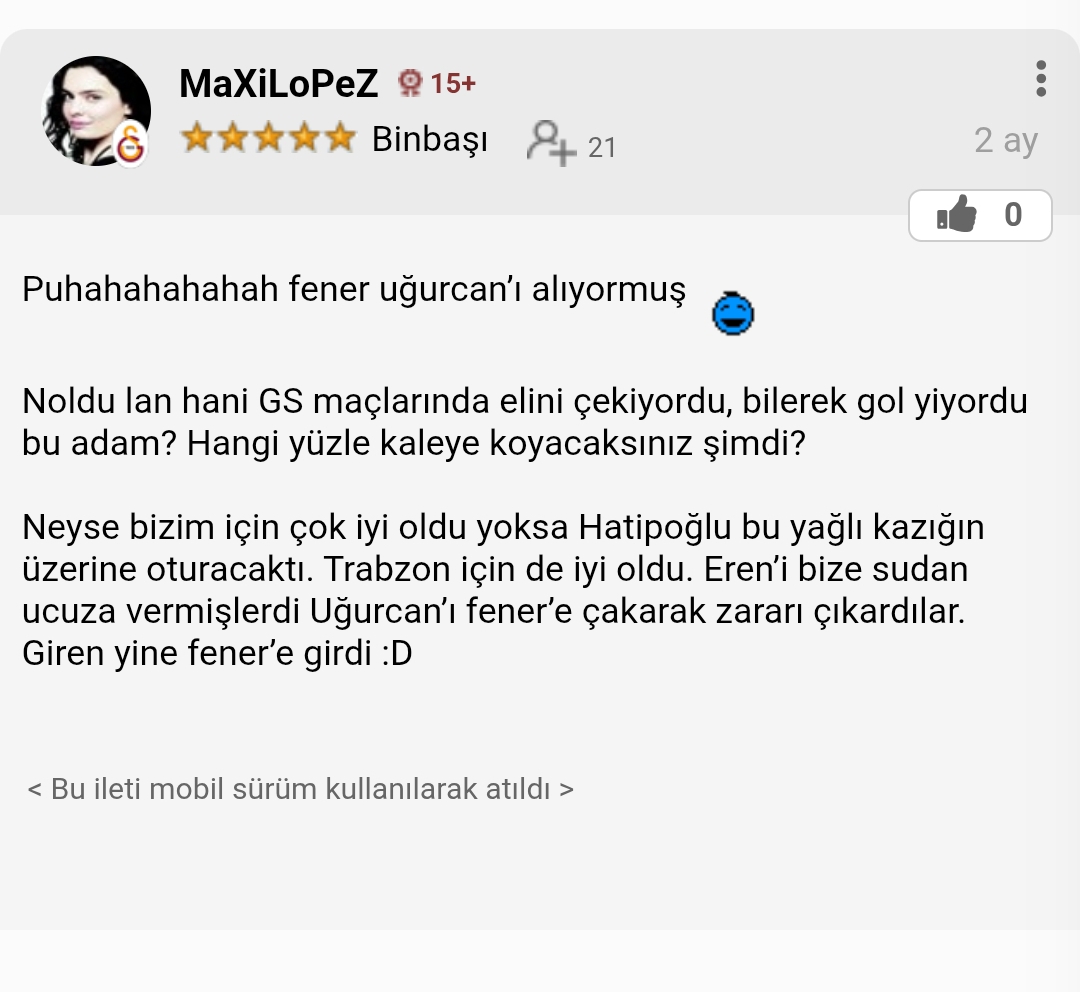 Bölüm yöneticisi arkadaş, sponsorluğu eleştirenlerin mesajlarını neden anında siliyorsun? Rahatsız olan Fenerbahçeli Türk evlatları istediği tepki gösteremeyecek mi? Hakaret yok birşey yok, sayfayı yeniliyoruz mesajların yarısı uçmuş oluyor. Eski bir admin olarak takipçisi olacağım. |