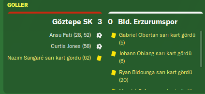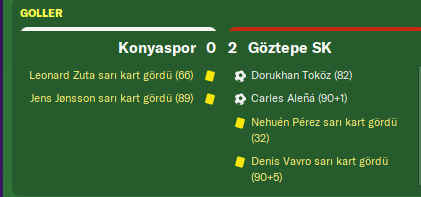 ikinci sezon tam istediğimiz özellikteki oyuncuları aldık, kiraladık. kendi takımımızı kurabildik bu sebeple sorumluluklarımız daha da arttı. sezona şahane başlangıç yaparak tüm dikkatleri üzerimize çektik. bu sezon rakiplerimiz dolu dizgin devam eden gs ve toparlanan bjk olucak gibi duruyor. 2. SEZON İLK YARI FİKSTÜRÜ < Resime gitmek için tıklayın > < Resime gitmek için tıklayın > PUAN DURUMU < Resime gitmek için tıklayın > Korkmayın Güvenin Kendinize Layık Olun Göztepe'mize ilk yarıda formasının hakkını sonuna kadar veren ve taraftarların sevgilisi haline gelen oyuncular. Francisco Trincão < Resime gitmek için tıklayın > Thierry Correia < Resime gitmek için tıklayın > Borja Mayoral < Resime gitmek için tıklayın > Carles Aleñá < Resime gitmek için tıklayın > Gaetano Castrovilli < Resime gitmek için tıklayın > Oriol Busquets < Resime gitmek için tıklayın > Emre Kılınç < Resime gitmek için tıklayın > Emre Kılınç transferinde çok emeği olan @stig hocamıza teşekkür ederiz. Odoi ve Emre arasında çok kararsızdım ikisini de denedim fakat Emre çok daha yararlı şu anda takımımız için. bu sezon takım daha bi istediğimiz gibi oynuyor. oyuncuların gençliğinden ve benim biraz gaza gelmelerimden kaynaklı zorlu maçlarda beklediğimiz oyunları oynayamadık. savunmadaki sorunları çözmek için devre arası takviye/ler yapılabilir. orta sahaya rotasyon amaçlı mutlaka tavsiyeler gelecek. Özellikle Busquets'in olmadığı maçlar fazlasıyla zorladı. Trincao ve Correia sağ kanadı gerçekten forse etti, çok iyi uyum sağladılar. |