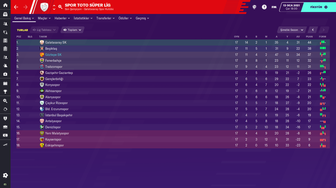 Renktaşlarımızın başarısı bizim başarımızdır Göztepe'nin kadrosunu beğeniyorum ama ilerde daha iyi yerlere gelecektir inşallah Hocam sezonu 3.sırada tamamlamak müthiş bir iş olmuş tebrik ederim. 3.sezonu ve yaz transfer döneminin güncellemesini merakla bekliyorum |