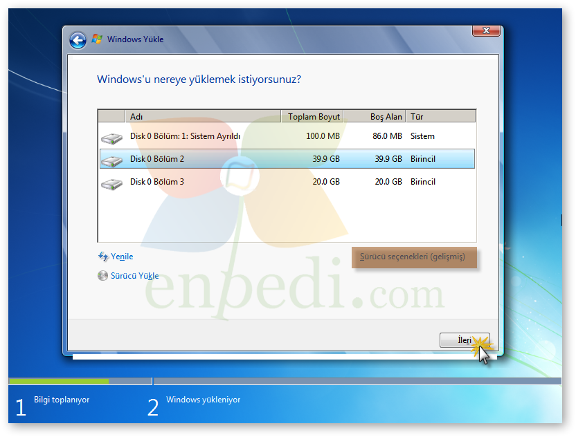C bölümünü SİL dedikten sonra TAMAM de (ayrılmamış bir yeni alan oluşacaktır) YENİ de, UYGULA de, İLERİ dedikten sonra sildiğin(C) bölümüne işletim sistemi kurma işlemine devam edersin.