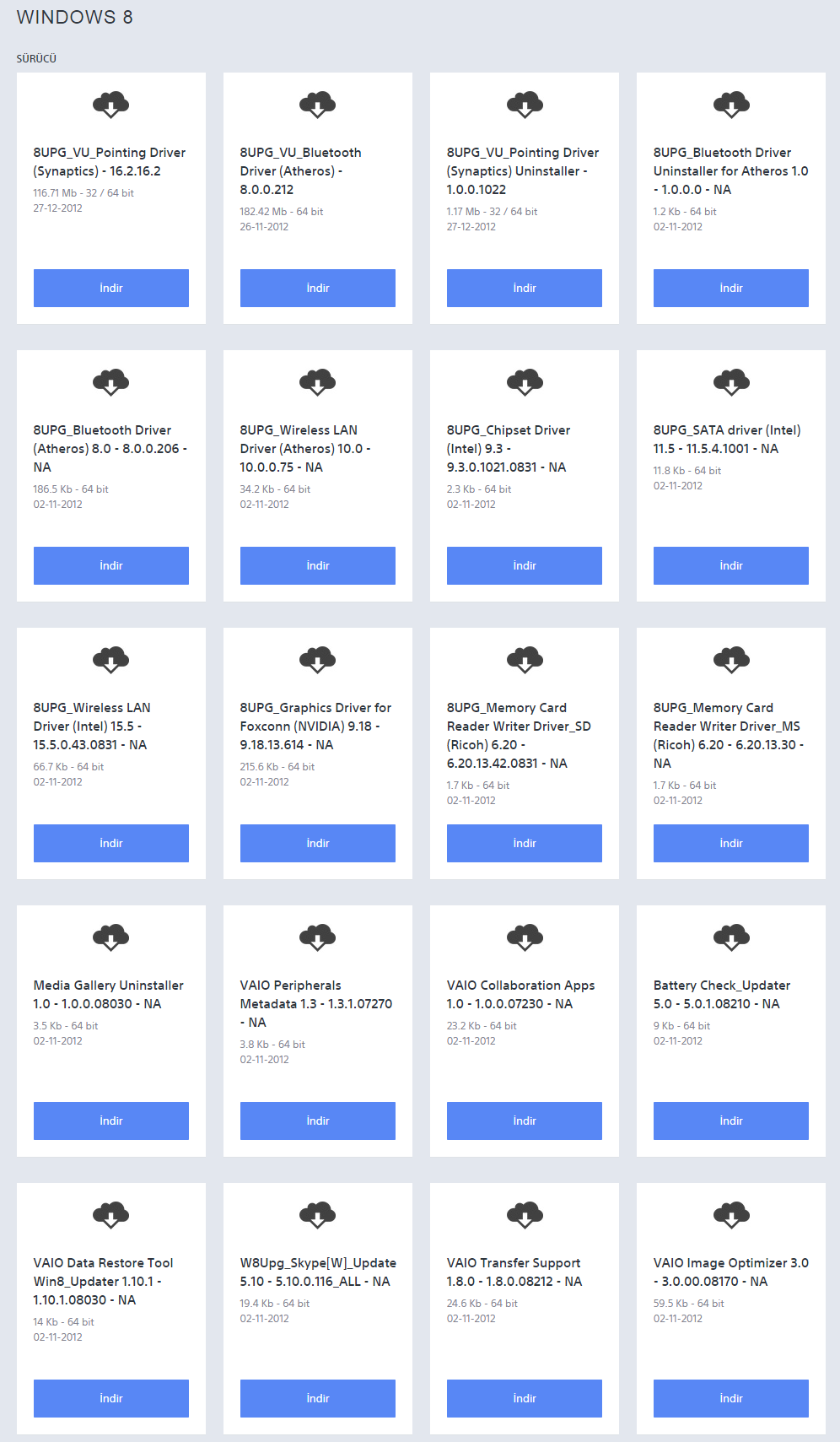 Önce net framework kur sonra driverlarını kurmaya başla. win7 için olan driverları ben şu an win8.1 de kullanıyorum çalışır sıkıntı olmaz Kuracağın driverlar: Ekran kartı, ses, touchpad driverı varsa onu kurarsın, birde klavye için vardır onu kur yeter. Edit: Hocam wireless, bluetooth vs çalışmazsa kur. |