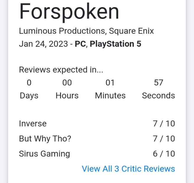 Opencritic'de 1 saat 30 dakika sonra incelemelerin düşeceğini gösteren sayaç var hocam. Metacritic'de farklı yol izleniyor olabilir. https://opencritic.com/game/13945/forspoken |