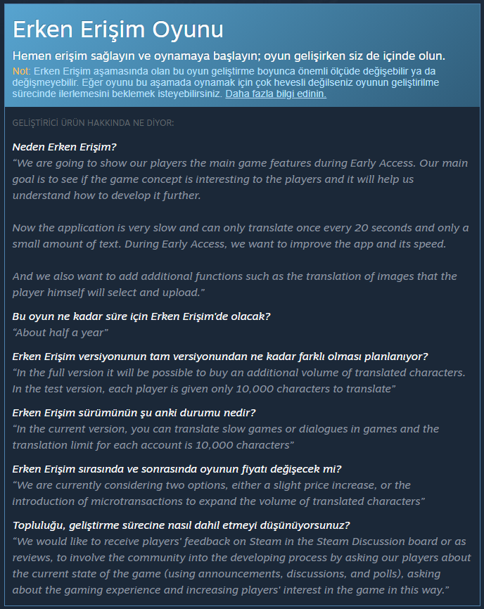 | Hızlı diyalog isteyen oyunlarda tavsiye etmiyorum. Bu arada biraz geç oldu ama programı aldım kullandım halen daha bazen kullanıyorum. eksiği çok var, bazı ayarları yapsan bile uygulanmıyor, yazıları çok üst üste bindiriyor örnek veriyorum: eu4 gibi bir oyunda bunu kullanırsanız yüzlerce yazı ekranı dolduruyor çoğu üst üste biniyor, çekilmez bir hal alıyor. Freeman Guerilla oyununda denedim ben. Oynadım iyiydi Adminin de dediği gibi geliştirme aşamasında destek gelirse daha iyi yerlere gelir Şu haliyle basit oyunlarda kullanılır. Renpy RPGM WOLF RPG motorlarıyla yapılan görsel roman oyunları için Translator ++ programını tavsiye ederim. tek tıkla koca metinleri çeviriyor, yeni sürümleri patreondan satılıyor alt sürümlerini nette araştırarak ücretsiz(yasal) bulabilirsiniz. Kullanımı ilede ilgili youtubede vs bir ton videosu var. |