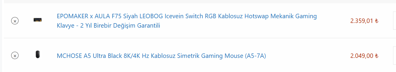 Merhaba, Şu anda laptop ve harici monitör içeren bir sistem kullanıyorum. 3-4 yıldır Logitech G300s mouse ve RAMPAGE KB-R57 X-JAMMER klavyesini kullanmaktayım. Masamda yer açmak için daha küçük bir klavye ve oyun için hafif, kablosuz bir mouse arıyorum. Aklımda AULA F75 klavye ve MCHOSE A5 Ultra mouse var. Bu ikili F/P olarak nasıldır? Bu bütçede 4000 TL civarı başka hangi modelleri önerirsiniz? Teşekkürler. < Resime gitmek için tıklayın >