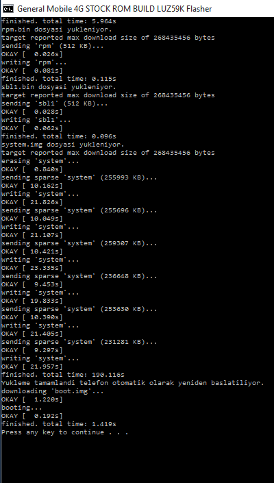 Şeklinde işlemin başarılı olduğuna dair mesaj alıyorum. Ama telefon hala bootloader modunda bekliyor. Kapanma/açılma yada tepki yok.