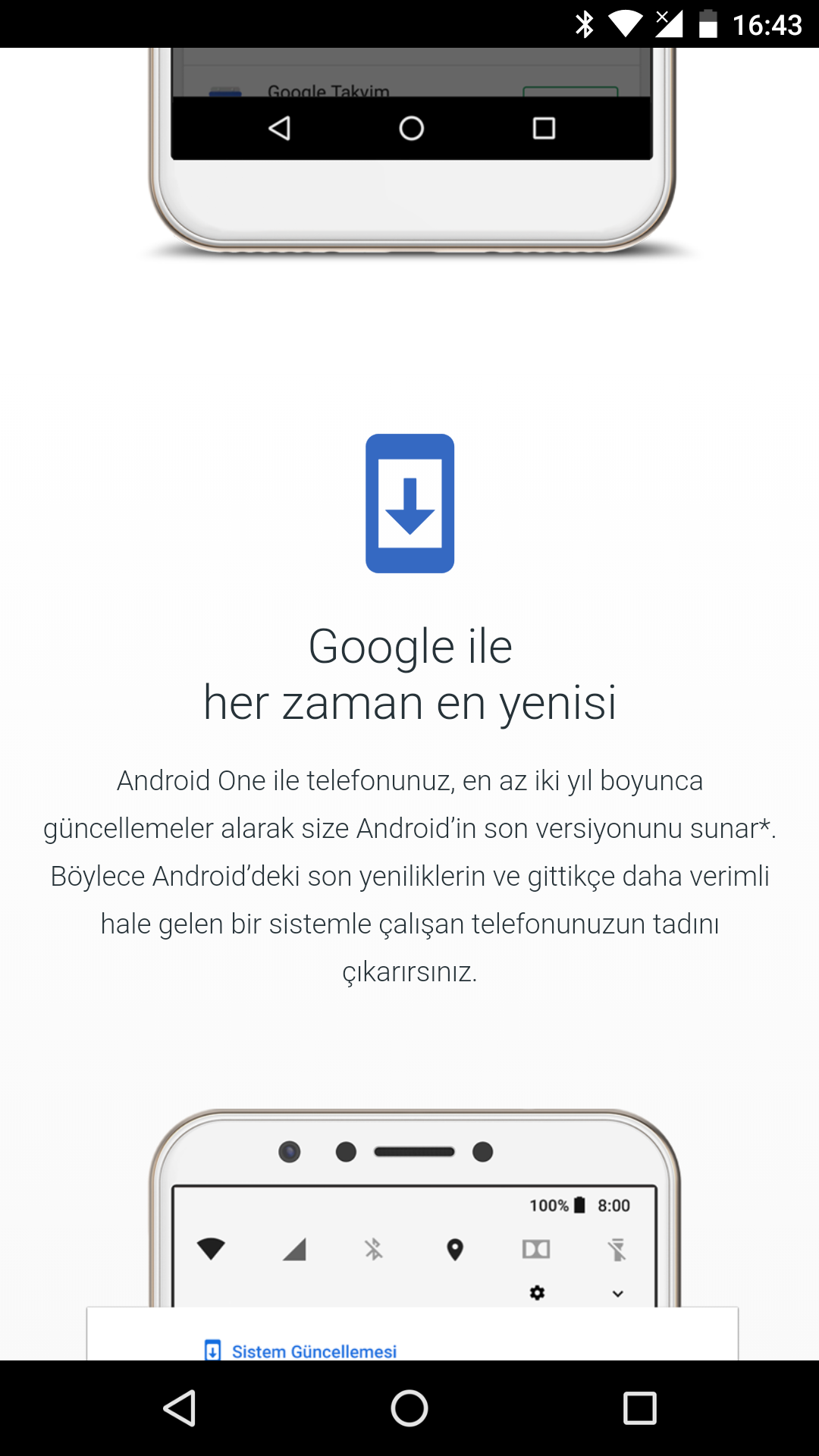 https://www.android.com/intl/tr_tr/one/ < Resime gitmek için tıklayın > Hiç oyun oynamayan biri olarak günlük kullanım için bence mükemmel bir cihaz. Tasarımı da çok şık. 4. jenerasyon Android One. Kamera performansı da eğer iyiyse; bu fiyata alınabilir. İşlemcinin Snapdragon 435 olması ise maalesef pil tüketimi olsun, sarj süresi olsun, kamera performansı olsun, hız olsun, çoklu işlem olsun her şeyi olumsuz yönde etkileyecek. Sebahattin Bey'in de dediği gibi umarım yazılım bunun dünyasını değiştirir. |