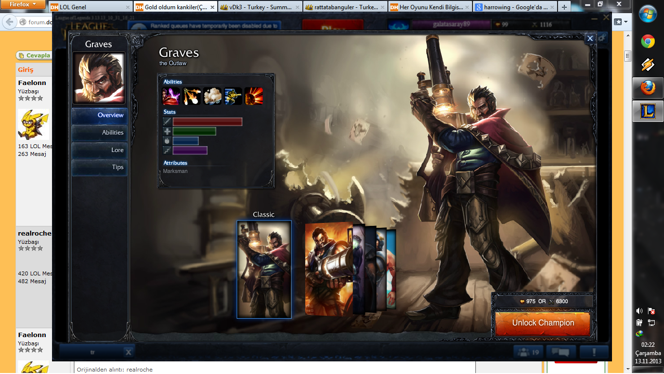 Duo arıyordum gerek kalmadı has duo'mla 4. maçta çıktım.Buradan bulletproof'a ilgisinden dolayı teşekkür ediyorum.Oynamadık belki ama düşünmen yeter En yakın zamanda elime geçecek kodu paylaşacağım büyük ihtimalle Riot Graves olacak.Graves'i olmayan kişilerin katılmasını istiyorum.Smurf'ler de olur +70 mesaj sahibi kişileri , hesabında graves'inin olmadığına dair ss'i özel mesaj olarak yollarsa çekilişe dahil edeceğim.Büyük ihtimalle bu hafta ya da öbür hafta sonu kod elime geçer sonucu açıklarım. Bol şanslar