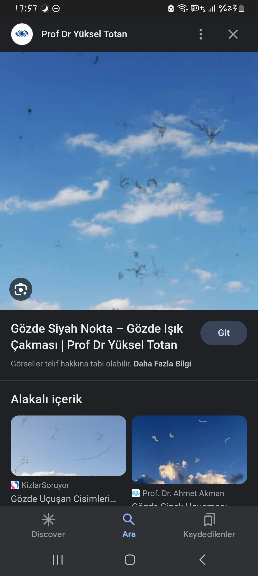 Bir kaç aydır gözümde uçuşan noktalar var . Her gün artıyor. Gitmediğim doktor kalmadı. Sorun yokmuş ama ben fazlasıyla kafaya takıyorum. Normal bir durummuş. Acaba yaşayan vat mi nasıl üstesinden gelijir < Resime gitmek için tıklayın >