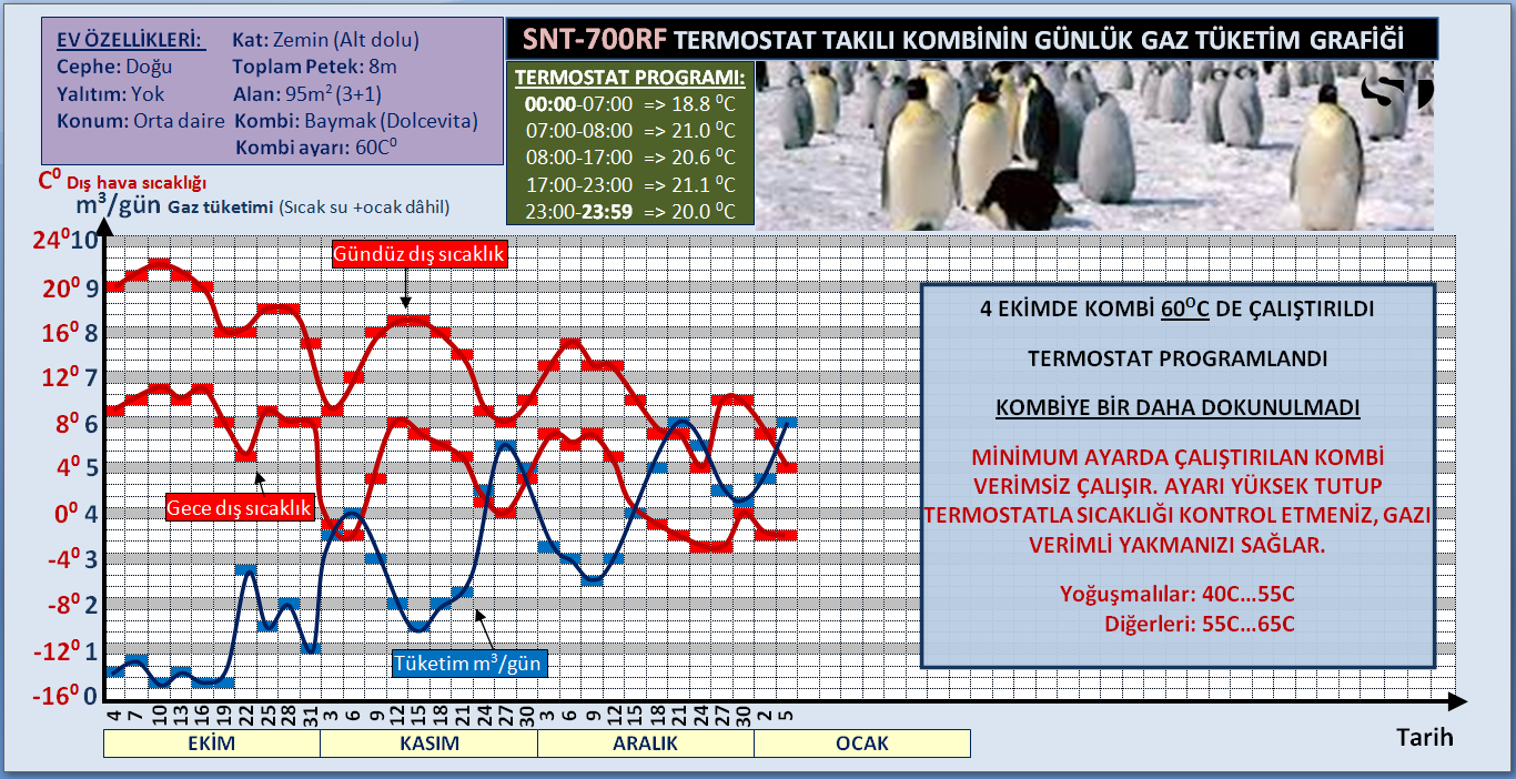 Şu an şunu yakıyorum değil. 4 Ekimden bu yana 3 günlük ortalamalarla oluşturulmuş tüketim grafiğim. Ayrıca 3 günlük gündüz ve gece dış hava sıcaklıkları. Evin tüm özellikleri ve termostat programı yani her şey grafik üzerinde. Grafik 3 günde bir yenileniyor. Ankara Dikmen < Resime gitmek için tıklayın > |