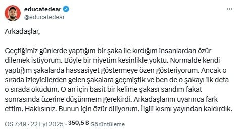"Geçtiğimiz günlerde yaptığım bir şaka ile kırdığım insanlardan özür dilemek istiyorum. Böyle bir niyetim kesinlikle yoktu. Normalde kendi yaptığım şakalarda hassasiyet göstermeye özen gösteriyorum. Ancak o sırada izleyicilerden gelen şakalara geçmiştik ve ben de o şakayı ilk defa o sırada okudum. O an için basit bir kelime şakası sandım fakat sonrasında üzerine düşünmem gerekirdi. Arkadaşlarım uyarınca fark ettim. Haklısınız. Bunun için özür diliyorum. İlgili kısmı yayından kaldırdık."
