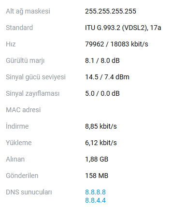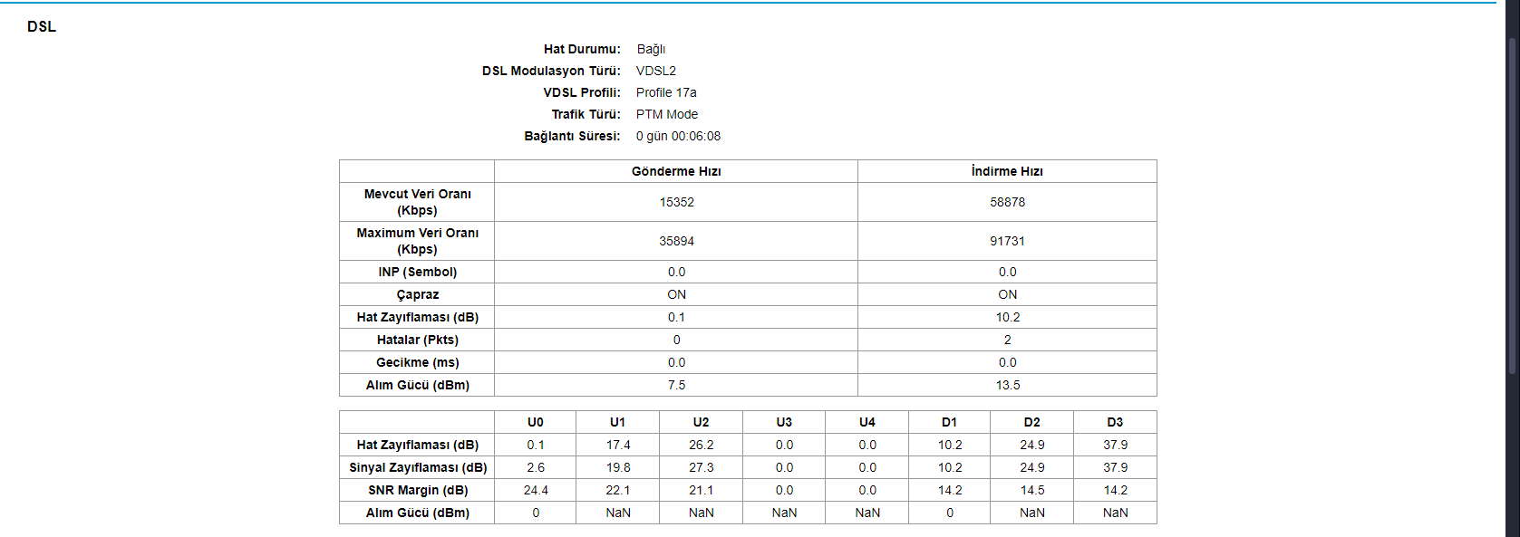 | Hattınızı resetlesinler. Down snr düşük, down mevcut hız ile ulaşılabilir hız aynı. Mevcut hızı düşürmek lazım. 50 civarına, hız-snr ayarı yapabileceğiniz Keenetic veya Asus modemle kendiniz hız ayarı yapıp, stabil noktada sabitleyebilirsiniz. |