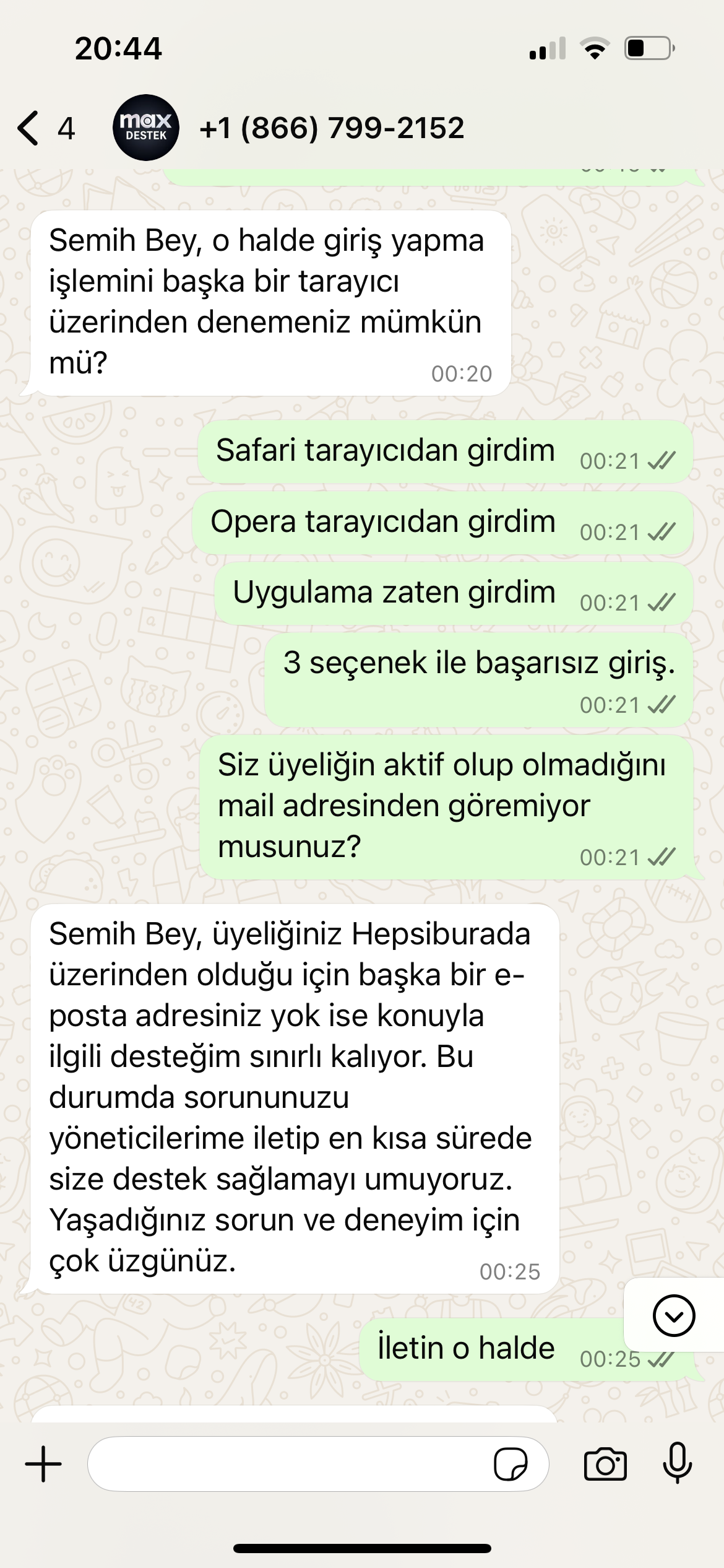 Blu tv şifremle giriş yapamıyordum. Buna istisnaden max temsilcisi ile zar zor görüşüp bilgi aldım, ellerinden bir şey gelmediğini söylediler. Aynı zamanda Hepsiburada desteği açtırdım, onlar da max ile iletişime geçmemi söylediler. Tam kısır döngü kimsenin kimseden haberi yok. Max a giriş yapamıyorum şaka gibi. < Resime gitmek için tıklayın > < Resime gitmek için tıklayın > |