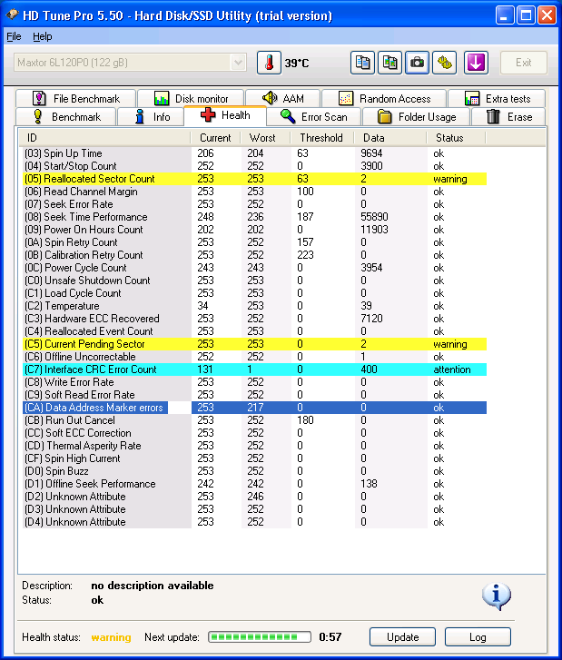 Diskinize gelirsek; Disk kendisine atfedilen ömrünü çoktan tamamlamış ancak siz ısrarla kullanmaya devam etmişsiniz. Muhtemelen bu disk ile kurulan işletim sisteminde takılma, donma, kilitlenme, rest atma gibi tüm faaliyetler çeşitli zamanlar da gerçekleşiyor olmalı. Ayrıca bu bilgisayarda çok yavaş çalışıyor olmalı. Disk için yorum gereksiz, en kısa zamanda bu diskin yenilenmesi gerekiyor ömrünün son günlerini yaşıyor desek pekte yalan olmaz. Solid diskler sadece işletim sistemini kurmak için kullanılır, bunun gayeside solid diskin yüksek hızlı okuma ve yazma performansından yararlanmaktır. Solid diskler dosya saklamaya, yedeklemeye, program yükleyip kaldırmaya çok uygun değillerdir, zaten boyutları da çok yüksek değildir, yüksek olanlar varsa da çok pahalıdırlar ve sizin sisteminiz için gereksiz bir harcama olur. O neden ile kendinize uygun büyüklükte bir disk almanız çok daha doğru olacaktır kanısındayım.