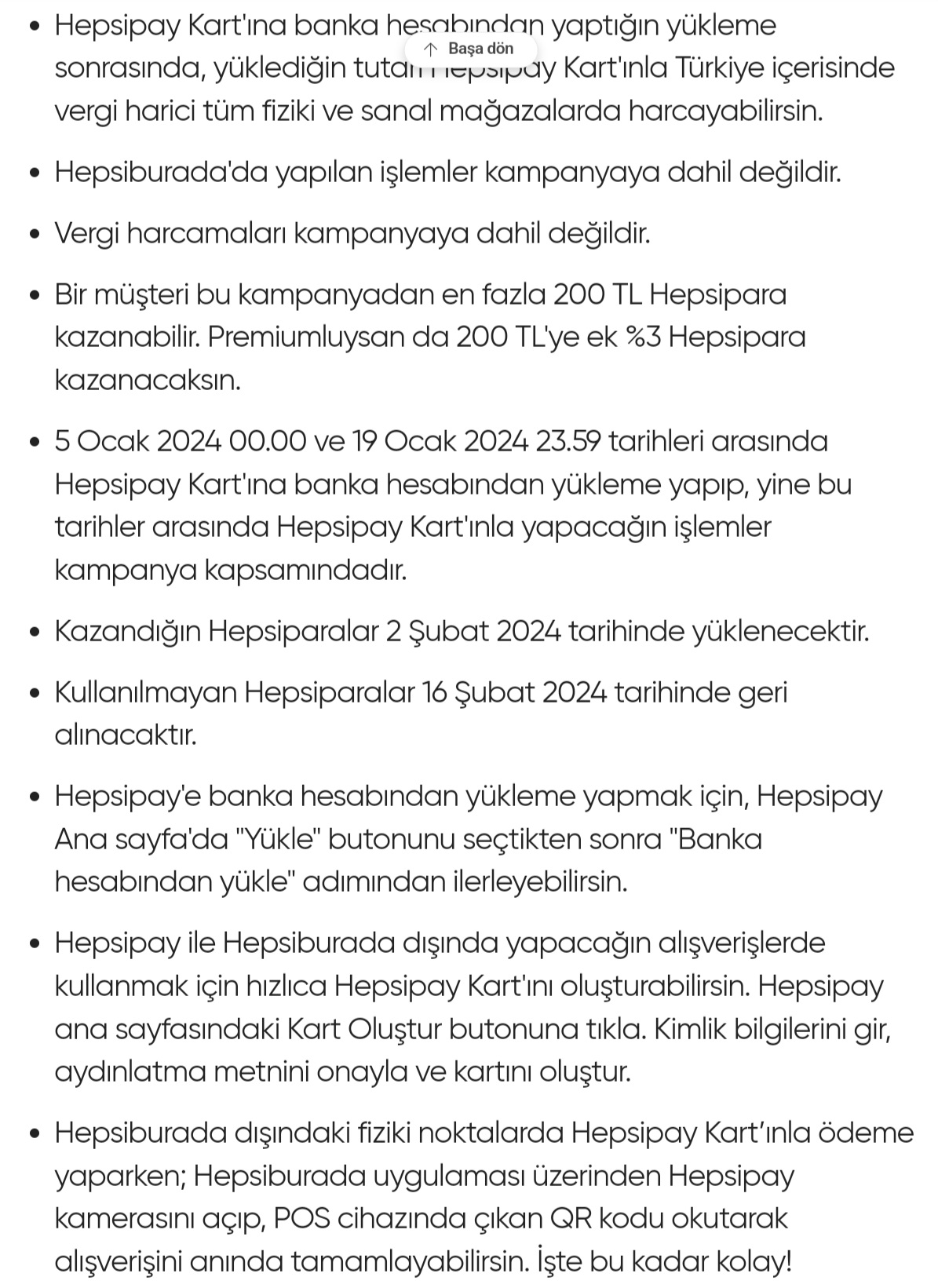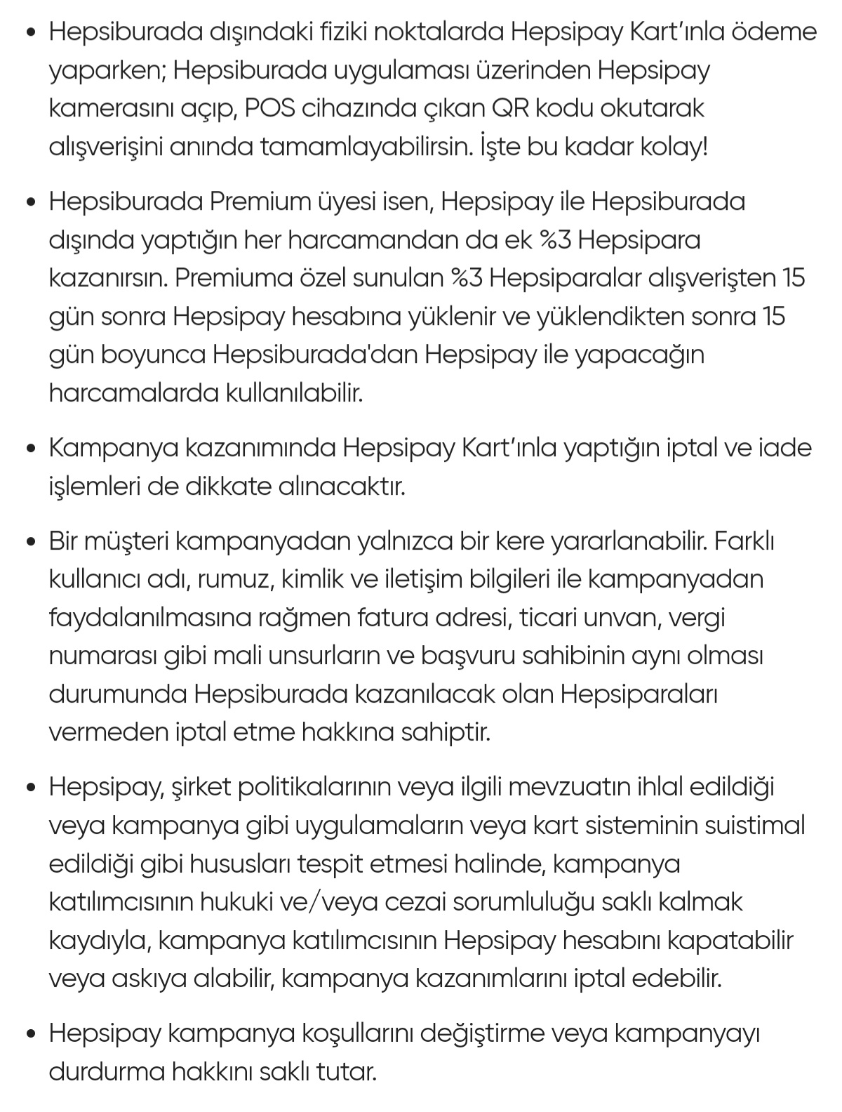 İlk kampanya sayfası aşağıda. 1- Cüzdan kredi kartı bilgileri yazıldıktan sonra geldi, peşin seçince kart puanı göründü, cüzdan seçince kayboldu, yani puan kullanımı devre dışı(bence çok önemli bir dezavantaj). 2- 10TL cüzdana hemen yüklendi. https://www.hepsiburada.com/staticpage/761309683226131 Hızlı Öde Hep Kazan(Trendyol benzeri %1 ve %2 kazanma) https://www.hepsiburada.com/hizliodehepkazan Detaylar(Gözüme çarpan dezavantajlar) Efsaneler Kulübü üyeleri için Hepsipapel kazanım üst limiti günlük 200 TL, aylık 1000 TL Hepsipapel’dir. Efsaneler Kulübü üyesi olmayan müşteriler için Hepsipapel kazanım limiti günlük 75 TL, aylık 500 TL Hepsipapel’dir. Bir aylık süre hesaplanırken son 30 gün içinde Hepsipay Cüzdanım ile yapılan alışverişleriniz dikkate alınır.