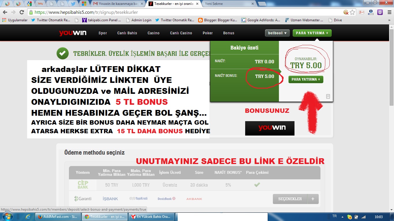 http://****/BETBOO-BONUS burada da 5 TL LİK BONUS VAR YANLIZ BU BONUS ÜYE OLDUKTAN 24 SAAT SONRA HESABA 5 * 1 OLARAK YANİ 5 ADET 1 ER TL LİK BONUS OLARAK YATAR ÜYE OLUP BONUSU ALANLAR KONU ALTINA YAZSINLAR LÜTFEN SİZE RESİM DESTEĞİ İLE YARDIMCI DA OLOUYORUM