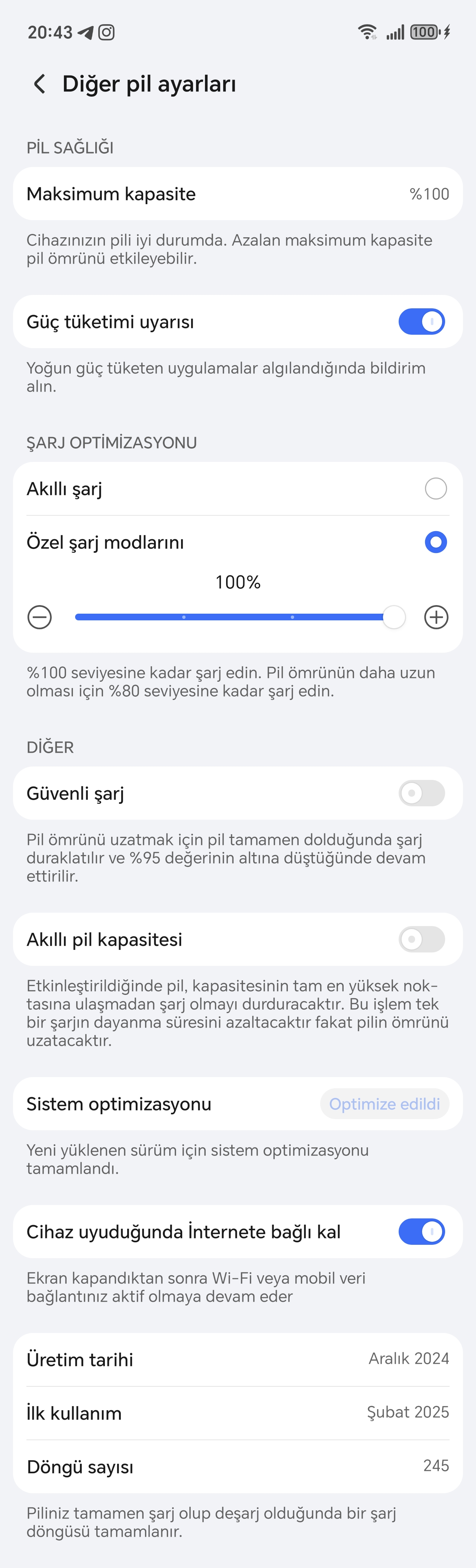 Pil konusunda bir türlü bunun cevabını bulamadım battery guru uygulamasında pilimin mAh değeri asla 5850 mAh göstermiyor ve telefonun kaç mAh değerinde şarj olduğuna baktığımda %100 de iken 5300 mAh değerlerinde gösteriyor ve sonra 5850 mAh değerine kadar acaip yavaş şekilde gidiyor. Bütün pili maksimum şarj olaylarını kapatmama rağmen niye %100 de 5850 mAh değer göremiyorum anlamadım 5250 civarlarında şarj göstergem %100 oluyor sizde de bu durum var mı cihazım bu arada c94e < Resime gitmek için tıklayın > < Resime gitmek için tıklayın > |