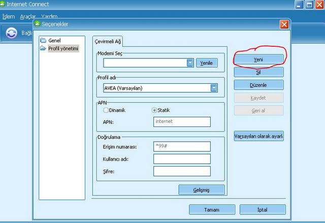 > ağ erişim noktası dedikten sonra,yeni bir profil belirle diyeceksiniz, "avea gprs wap" isminde oluşturacaksınız