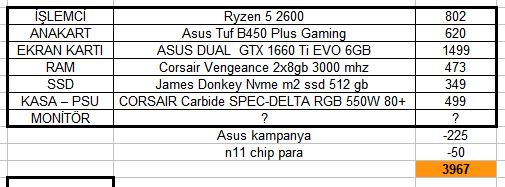 Arkadaşlar, gün sonu 1660 ti,revizyonlu 1600, msi b450m pro-vdh plus, 2x 8gb 3000 ram, 1tb seagate hdd, ince hesaptaki fsp 80 silverli kasa.