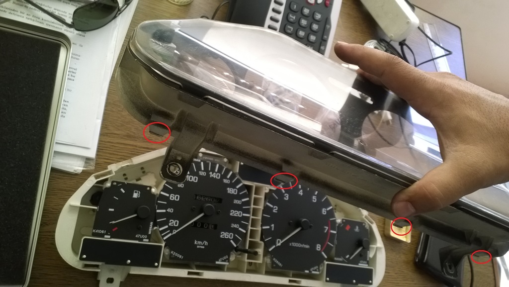 Merhabalar. Ne zamandır devir saatim bir kısım araç sahiplerinin de daha önceden anlattığına benzer bir problem ortaya çıkarmıştı. Uzun süredir el atmaya fırsat bulamamıştım. Artık tamamen çalışmamaya başlayınca da söküp artık çaresine bakayım dedim. Bir yandan tamir ederken diğer yandan da fotoğrafladım. Kendisi yapmak isteyenler olur diye mümkün olduğunca ayrıntılı anlatmaya çalışacağım. Ben daha rahat çalışabilmek için buradan başladım işe. İşaretli yerleri yıldız tornavida ile sökün. Ve bu kapağın üst taraftaki parçasını yerinden çıkarın. Alt kısmı çıkarmanıza gerek yok. Direksiyon mandalını indirip direksiyonu en aşağı alın. < Resime gitmek için tıklayın > İşaretlediğim iki vidayı sökün. Çerçeveyi dikkatli bir şekilde özellikle alt kısmından çeker çıkarın. < Resime gitmek için tıklayın > Bir önceki fotoğraftaki iki vidayı söktükten sonra bu fotoğrafta işaretlediğim bu iki klips tutuyor bu çerçeveyi. Buna dikkat edin. Çerçeveyi yerinden ayırmadan gösterge aydınlatma düğmesinin soketi ile Arka cam buz çözücünün soketini tırnaklarına basarak çıkarın. < Resime gitmek için tıklayın > İşaretlediğim üç vidayı söktükten sonra gösterge panelini dışarı alın. Arkasında bulunan üç adet soketi tırnaklarına basarak yerlerinden çıkarın. < Resime gitmek için tıklayın > İşaretlediğim tırnakları kurtararak (Arka tarafta da var bu tırnaklardan) panelin ön camını çıkarın. < Resime gitmek için tıklayın > < Resime gitmek için tıklayın > Eğer sadece devir saatini sökecekseniz fotoğrafta işaretlediğim 3 vidayı sökmeniz yeterli. Ben incelemek için tamamını söktüm aldırmayın. < Resime gitmek için tıklayın > Bu vidaları söktükten sonra bütün göstergeler boşa çıkacaktır. < Resime gitmek için tıklayın > Devir göstergesinin arkasındaki elektroniik kart üstündeki işaretlediğim lehimlere karşılık gelen kapasitörleri havya yardımıyla çıkarın. İki adet 50v 1 uF ve bir adet 16 v 1000 uF değerindeki kapasitörü değiştirin. Forumun başlarında 50 v 2.2 uF olanı da değiştirin yazıyordu ancak ben değiştirmeden şansımı denemek istedim. Bu üçünü değiştirdikten sonra sadece soketlerini takara araç üstünde çalışıp çalışmadığını kontrol ettim çalıştığını görünce bu sonuncuya dokunmadım. Tabi arıza bunlardan birinde ya da birkaçında olabilir. Kapasitörün nasıl ölçüleceğini bilmediğimden ben üçünü de değiştirmiş oldum. Kapasitör ölçümü yapmayı biliyorsanız sadece arızalı olanı da değiştirebilirsiniz. < Resime gitmek için tıklayın > < Resime gitmek için tıklayın > < Resime gitmek için tıklayın > Ve sonuç < Resime gitmek için tıklayın > Gösterge paneli aydınlatma lambalarının ölçüsünü merak edenler için çektim bu fotoğrafı. Normal dipsiz park ampülü. Diğer ampüller bunların yarısı kalınlığında ki zaten onlar ikaz lambalarına ait ampüller. Sadece işaretlediklermi değiştirerek gösterge panelinizin aydınlatma rengini değiştirebilirsiniz. < Resime gitmek için tıklayın > Hadi kolay gelsin. |
