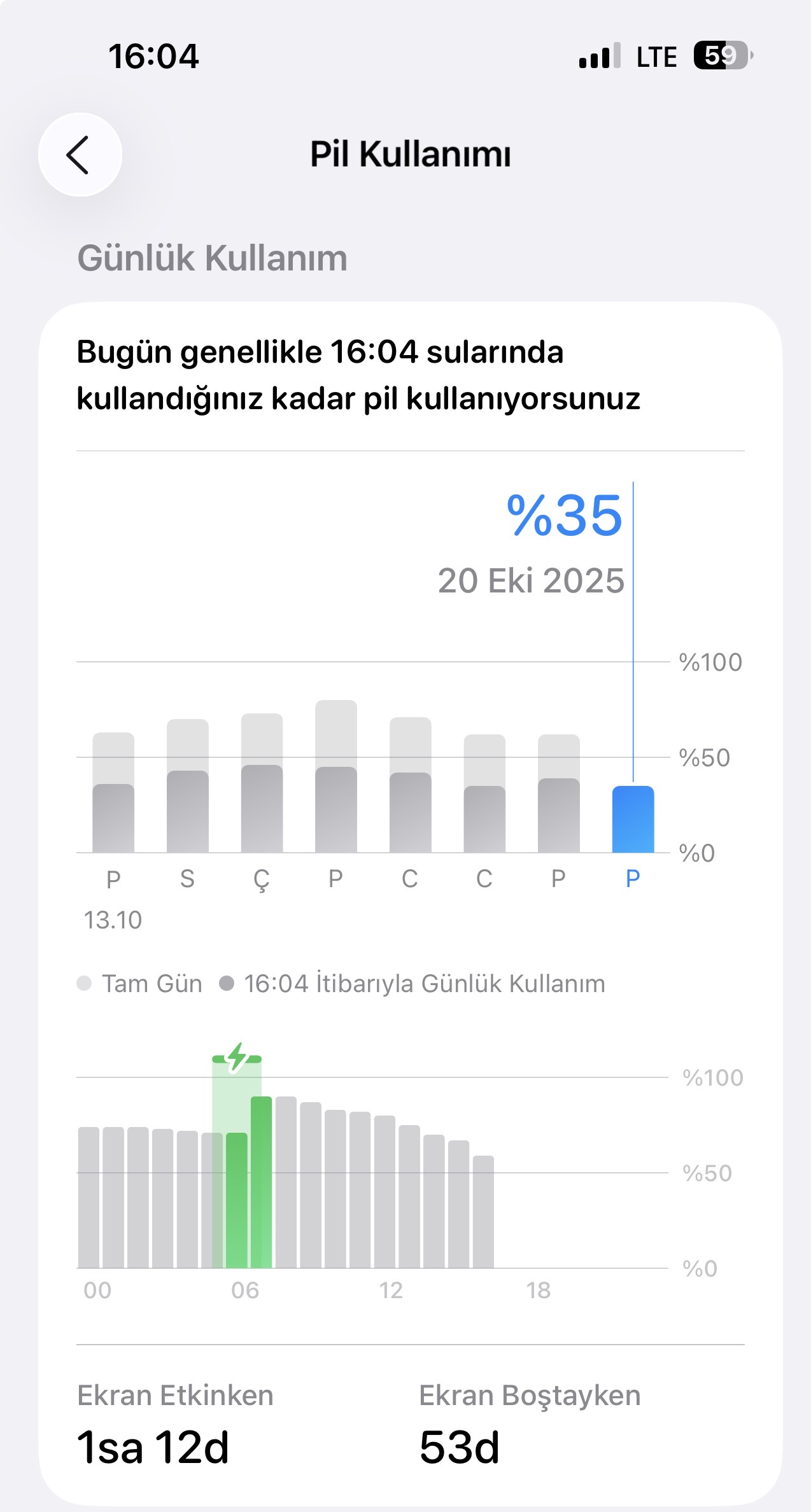 Grafikte bundan daha fazla detaya ihtiyacınız yok. Görünmeyen kısımda zaten hangi uygulamaların ne kadar yüzdelikle kullandığı görülebiliyor. Pille ilgili sorun olup olmadığı apple desteğin kontrolleriyle ortaya çıkar. Bence düşüşteki ekran süresiyle paralel olmayan düşüş pilde sorun olduğuna bariz işaret.