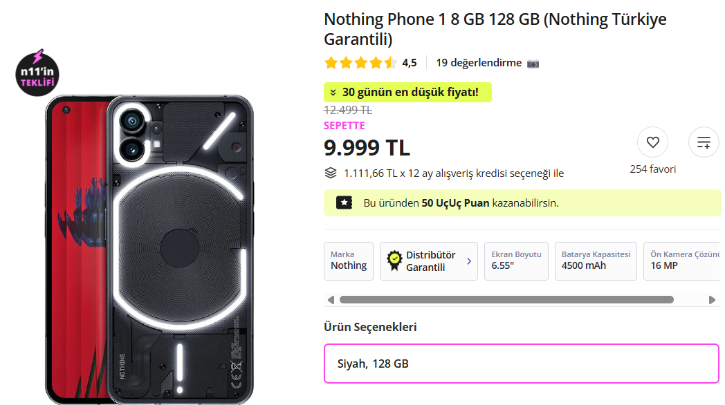 Kasım Ayı N11 de Nothing Phone 1 8/128 Bugüne Özel 9.999 TL Bu Fiyat Kaçmaz