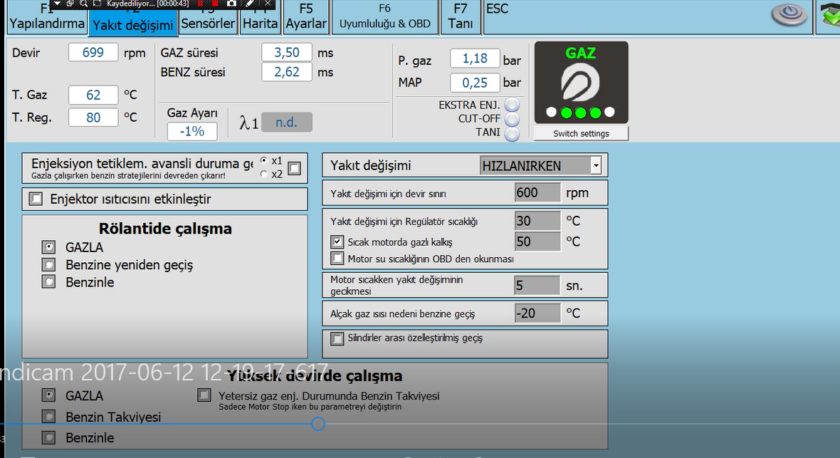 lovato rölantide en düşük 4.5ms lpg süresi olsun daha altı olmasın diyor. basıncı 1.2 den 1e çekerseniz on numara olur. onun dışında benim gördüğüm bir sorun yok. obd kapalı yol testine çıkıp gerekli yerleri düzeltin sonra obd açıp kaydedin. bir daha yıllarca ellemeyin. filtreleri 15 binde bir değiştirin tamam |