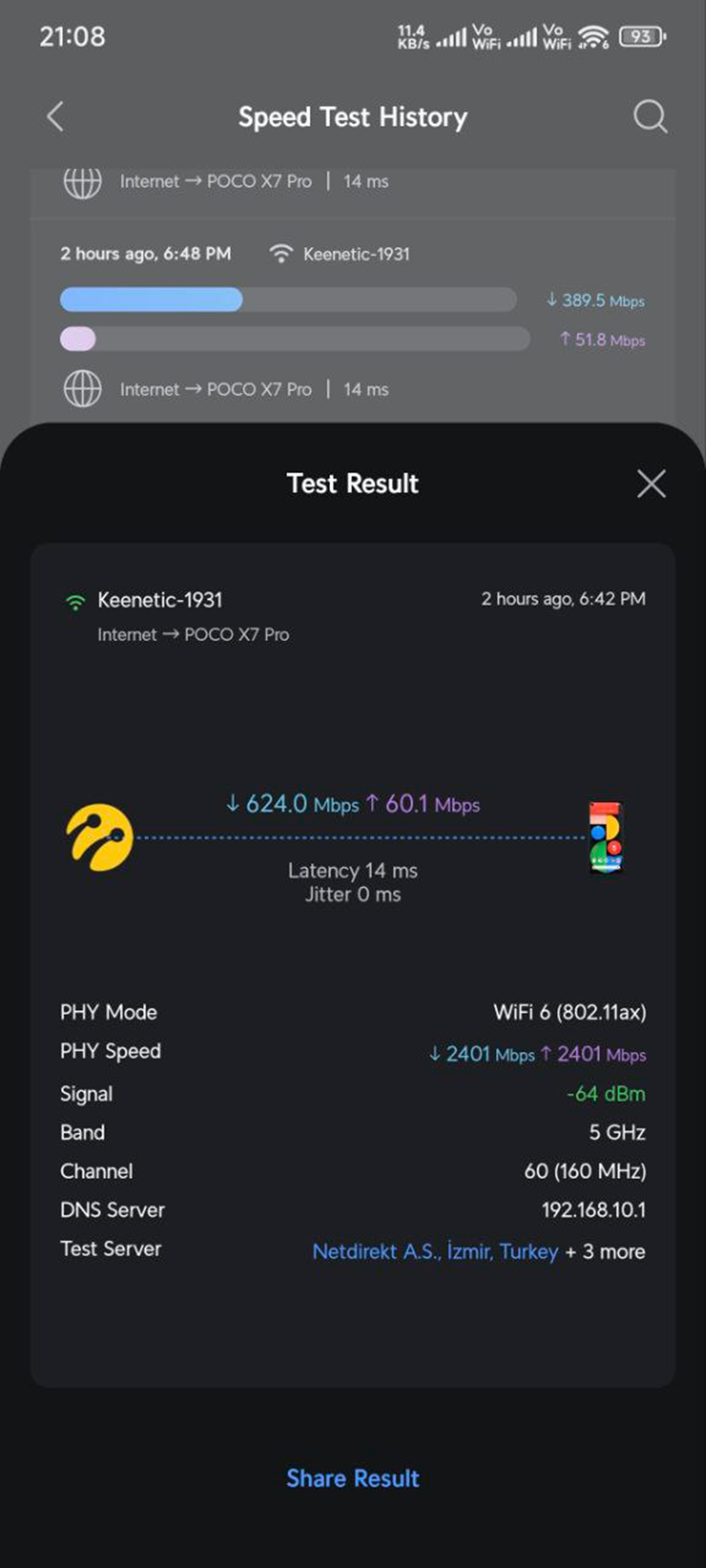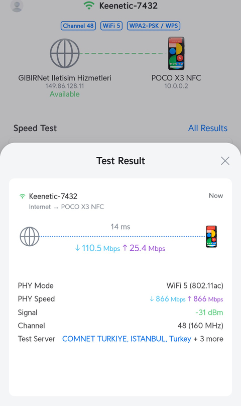 Konum : T2 -Uzak Mesafe- (Lokasyon olarak Keenetic Hero'ya en uzak nokta ve duvar engeli mevcut. Direkt router ile görüş yoktur.)