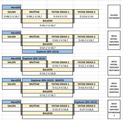 Test ortamı : Yaklaşık ~150 metrekare balkonlar hariç daire içerisinde, Keenetic Hero "X" olarak işaretli ve hol kısmını tam görür şekilde konumlanmıştır.