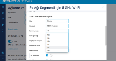5GHz ayarlar -> n/ac/ax, 12 saatte bir oto kanal tarama, 20/40/80/160MHz kanal genişliği, maksimum iletim ❌, 256-QAM ✅, Beamforming ✅, DL MU-MiMO ✅, DL OFDMA ✅, UL MU-MiMO ✅, UL OFDMA ✅, Airtime Fairness ✅, Hedef Uyanma Süresi ✅