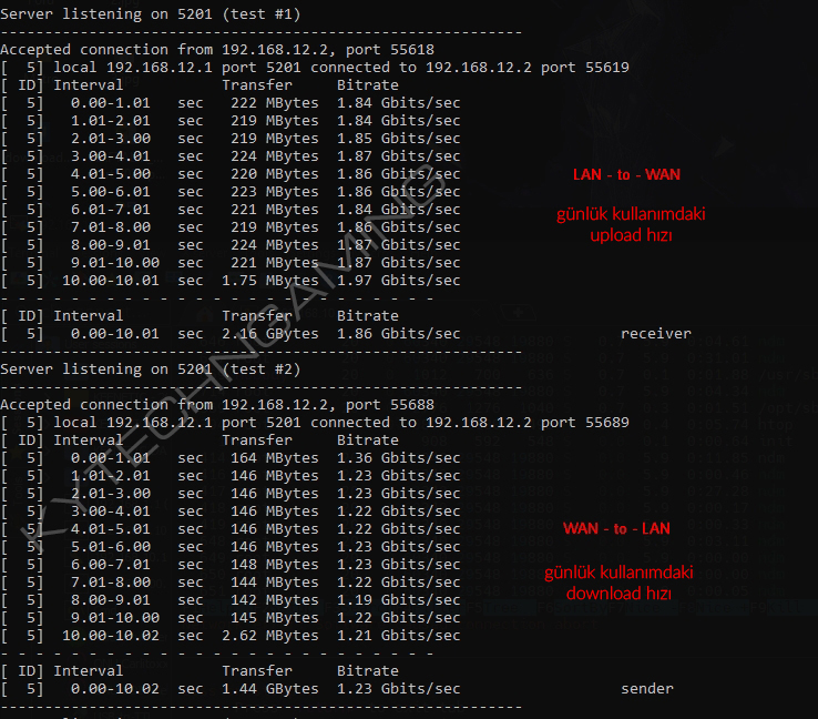 iPerf3 ile donanımların limitleri gözlemlenmiştir.