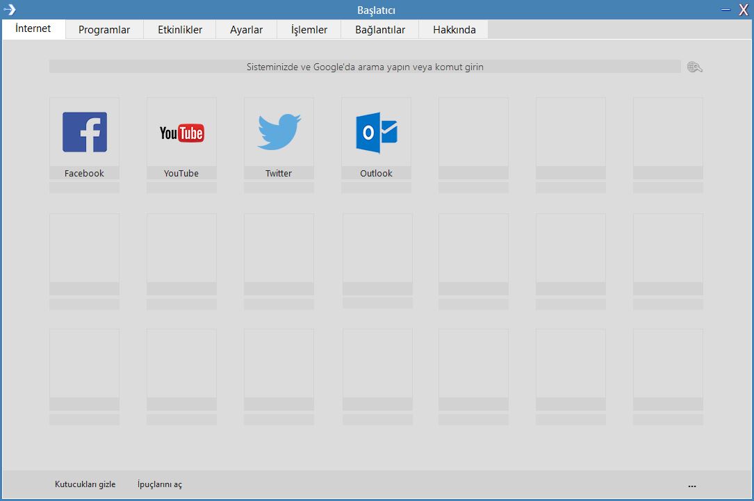 Nedir? Başlatıcı, favori site ve programlarınızın kısayollarını oluşturabileceğiniz gelişmiş bir arşiv programıdır. Bu temel işlevinin yanı sıra kendi içinde basit bir internet tarayıcısı, müzik çalar, gif oynatıcı gibi ekstra özellikler barındırır. Tarayıcı ve ayar sıfırlama özellikleri programa gömülü olan ayrı birer .exe dosyalarıdır. Bunun nedeni, ana programın bu işlevleri yerine getirirken yavaşlamamasını ve hata vermemesini sağlamaktır.