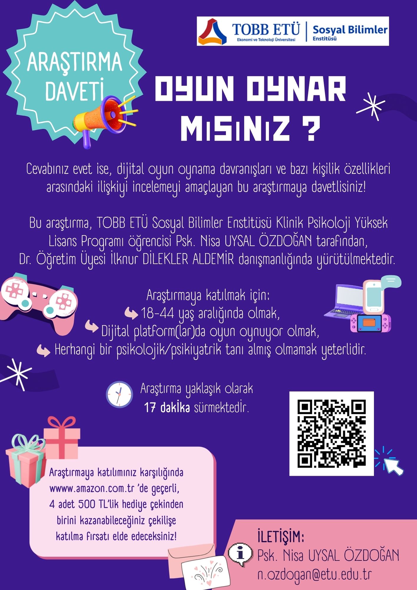 TOBB ETÜ Sosyal Bilimler Enstitüsü Klinik Psikoloji Yüksek Lisans Programı kapsamında yürüttüğüm tez çalışmamda, Dr. Öğr. Üyesi İlknur DİLEKLER ALDEMİR danışmanlığında, dijital oyun oynama davranışları ve bazı kişilik özellikleri arasındaki ilişkileri i < Resime gitmek için tıklayın > ncelemekteyim. Araştırmaya aşağıdaki bağlantıya tıklayarak katılabilirsiniz. Değerli katkılarınız için teşekkür ederim! https://tr.surveymonkey.com/r/DGPB06