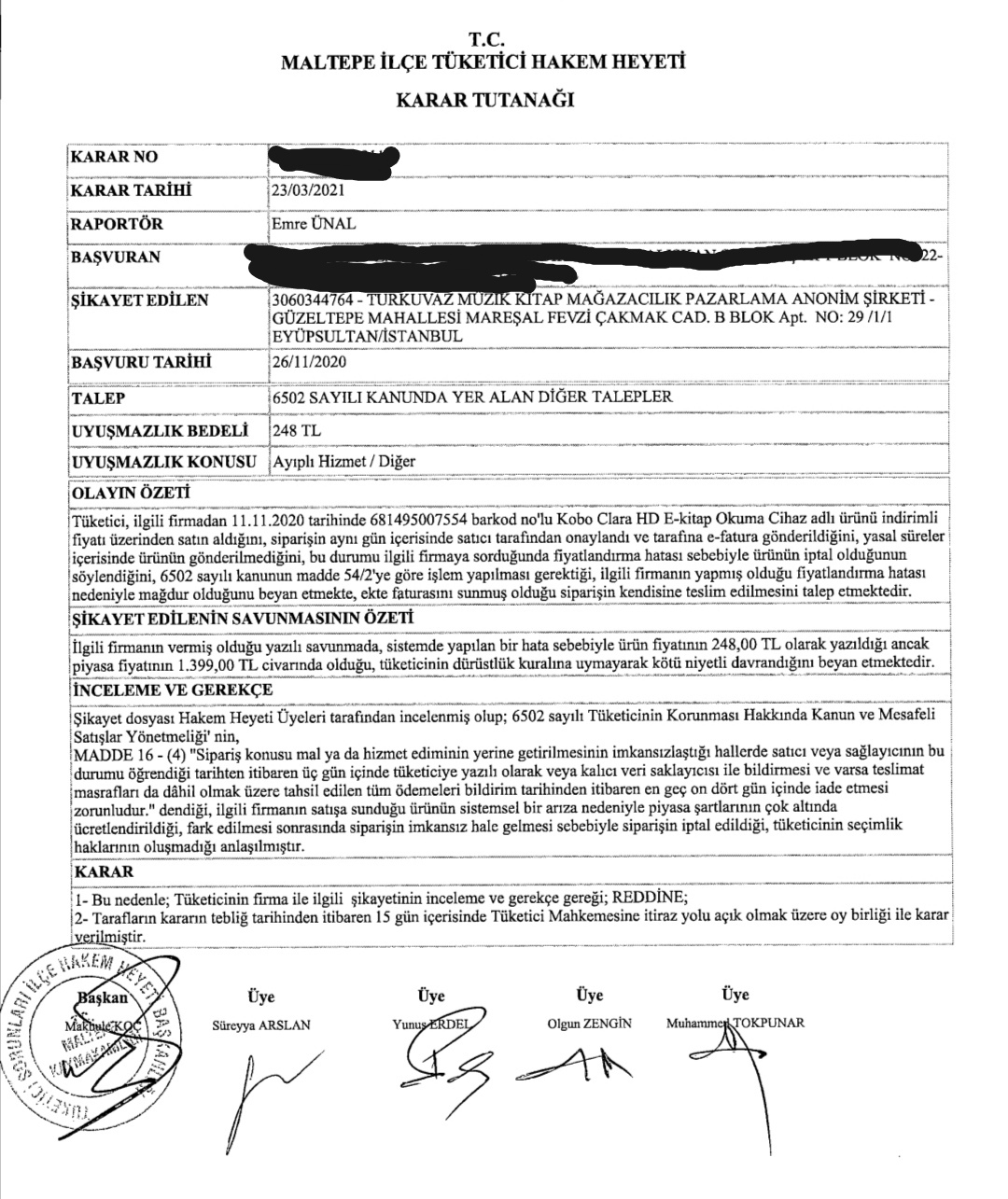 Ben ürünü indirimli aldığım için kötü niyetliymişim. İdefixin savunması bu yönde ve hakem heyeti onları haklı görmüş. İyi ki iade ettikleri parayı geri istemediler hakem heyeti onu da alırmış yoksa bizden. Ne diym arkadaş hukukta geldiğimiz nokta malesef bu.