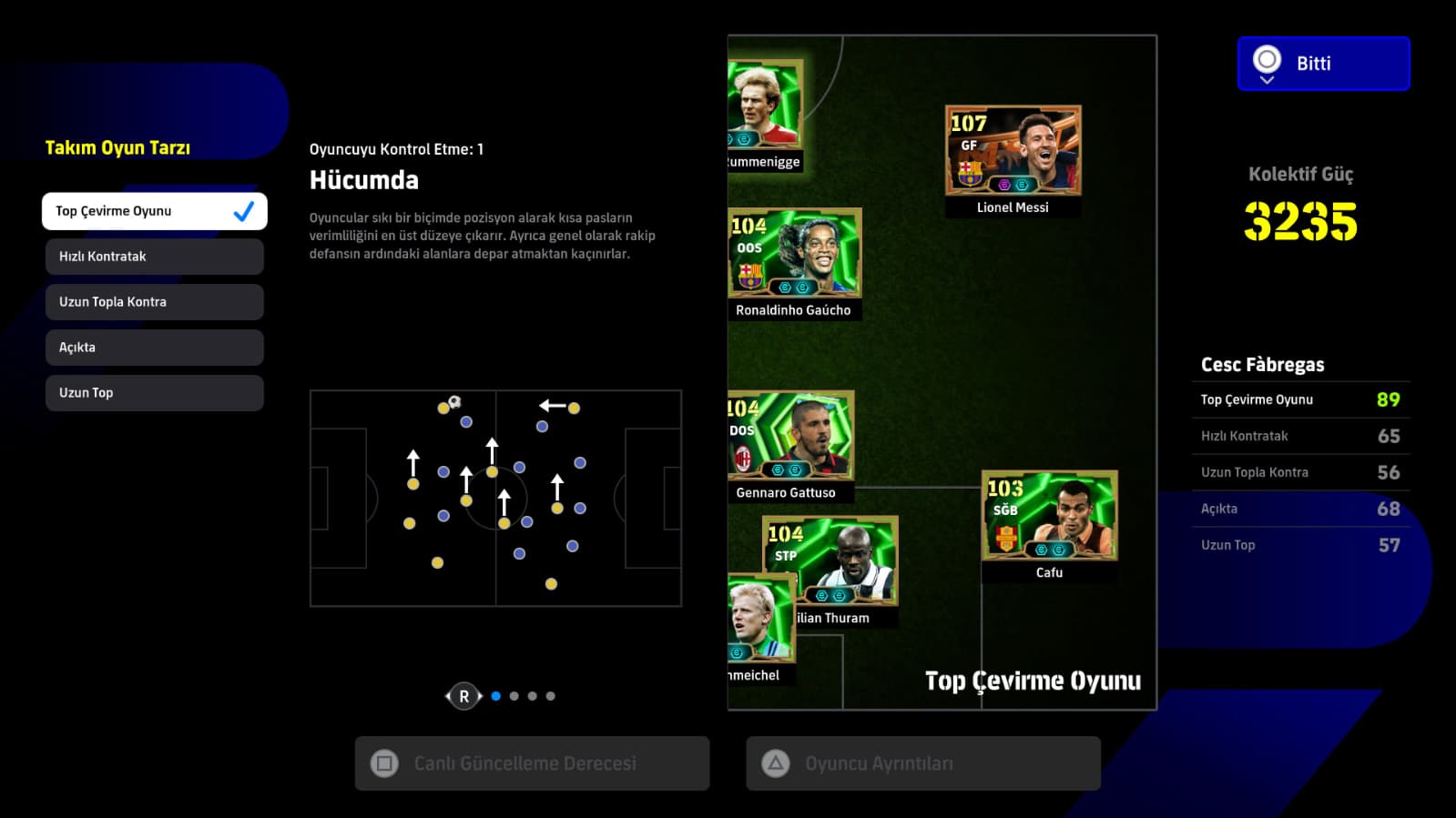 Oyun planı --> Takım Oyun tarına gireceksin. Teknik Direktörün Top çevirme özelliği en yüksek ise takım oyun tarzından onu seçmelisin. Bu TD ne göre değişir Örnek görselde benim TD top çevirme oynuyor takım oyun tarzını top çevirme yapınca oyuncular full gücünde oluyor. Ancak hızlı kontra atak seçersem oyuncuların gücü düşer. Ha bide arkadaşın dediği gibi TD iyi değilse de düşük olur Gattuso AÇIKTA oynuyor. Takım oyun tarzını açıkta seçmelisin Güçlendirici 100 tane olunca istediğini ekleyebilirsin. Veya rastgele güçlendirici kullanıp kısmetine çıkanı eklersin < Resime gitmek için tıklayın > |