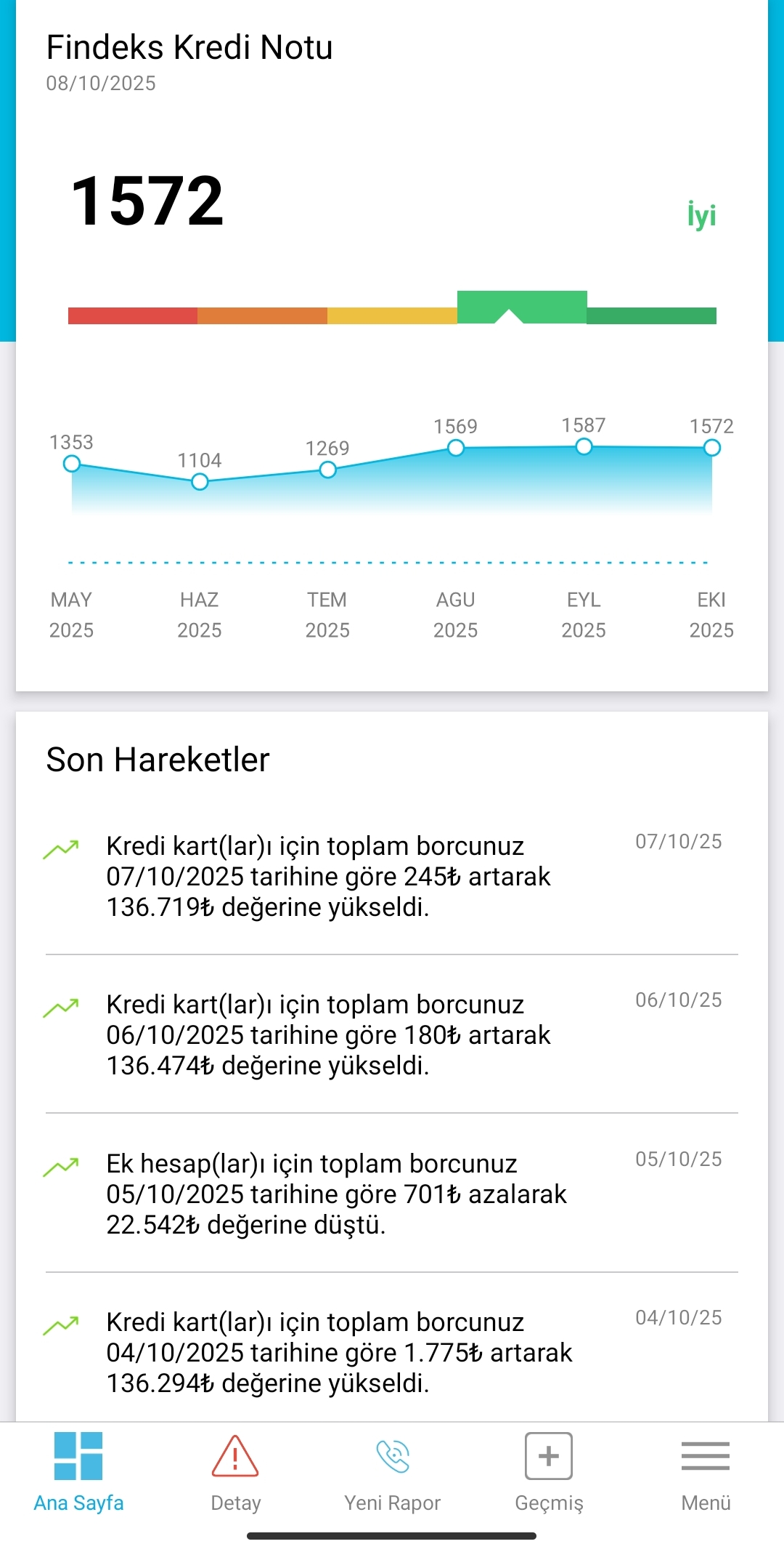 Yine de Kredi Yeniden Yapılandırma bankalar ve Findeks nezlinde ciddi bir negatif durum olarak değerlendiriliyor. Hatta Findekste bu görünüyor. Taksitli Avanslar ve harcamalar bile göürünüyordu. -Mevcut kullanımdaki borç limit oranı güzel görünüyor. %75leri aşsa bile anlık olarak puan düşüyor ama ödeme yapılınca tekrar yükseliyor. Beklemek ve yeni başvurudan bir süre kaçınmak gerekebilir. -KMH ları kesinlikle kullanmamak gerekiyor. Çok ufak rakamlar bile kullanılsa KMH'ta puan fena halde hızlı düşüyor. Geçen ay 50.000 tl kadar Garanti Bankasından Taksitli Nakit Avans tanımlamıştı 2.29'dan. Hemen kullandım. 1587olan puanımı bir anda 1500ün altına düşürdü. |