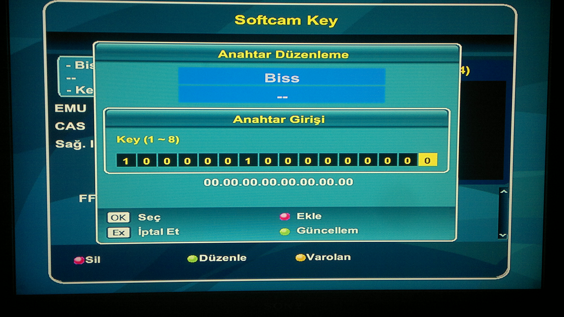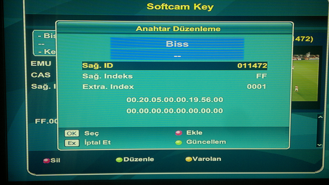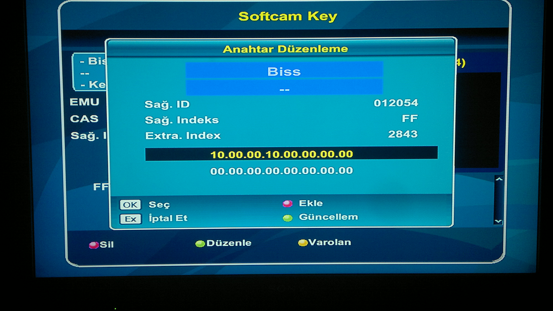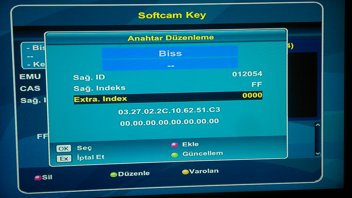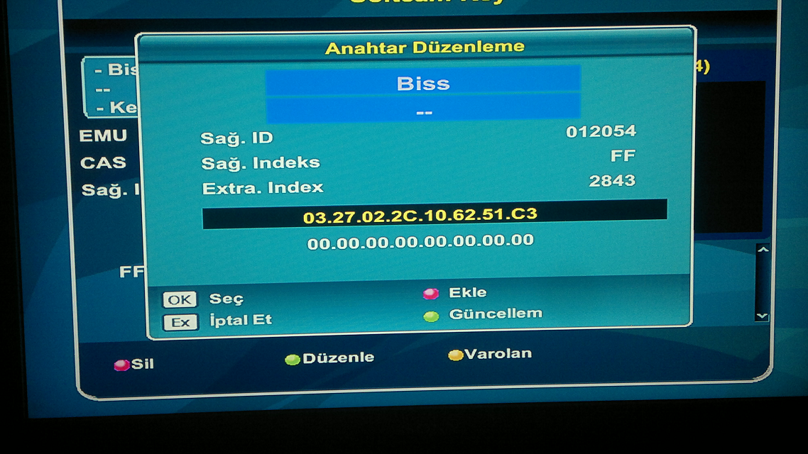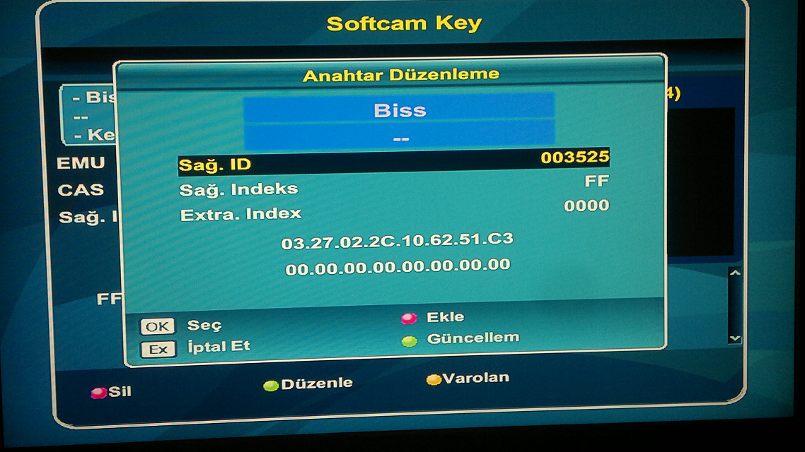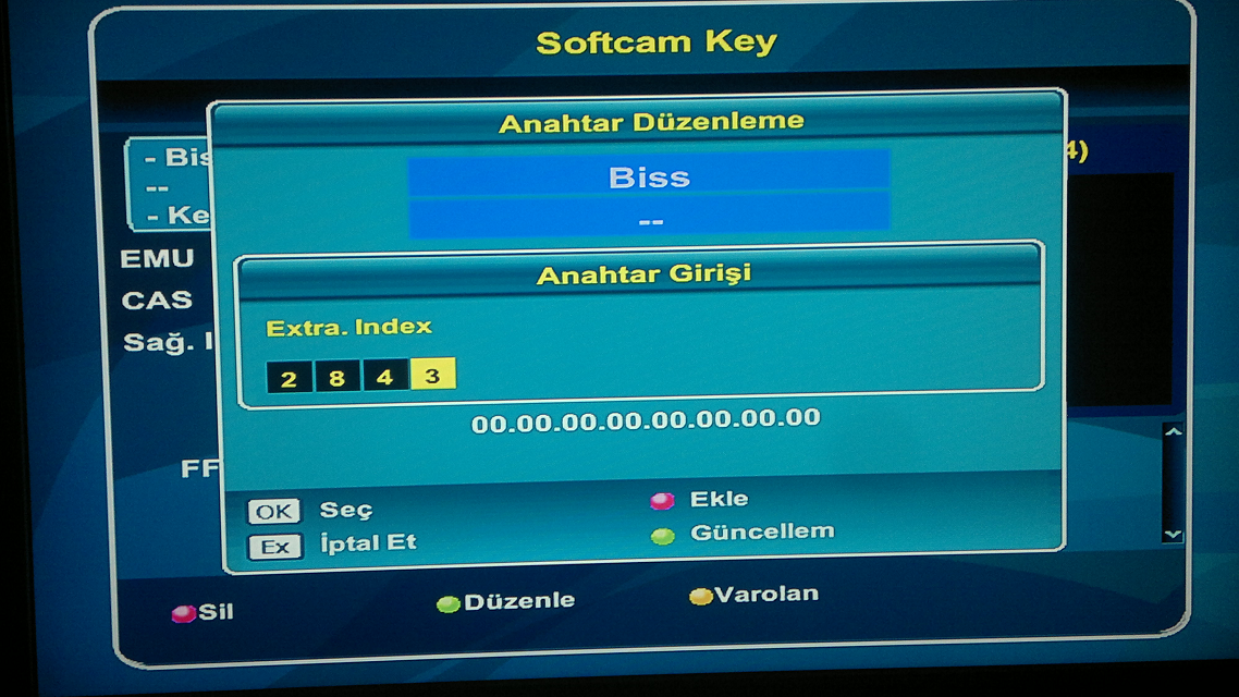 · Yeni biss key eklemek için; Menü, 2580, Düzenle (Yesil) , Sag. ID OK (Kanalin Frekansi) , Sag. Indeks OK (00, 01, FF, FE ya da FB) , Ekstra. Index OK (Kanalin Service identi. (SID) , Key OK ( Örnegin; 1000000000000000 ) , Ekle (Kirmizi) OK.