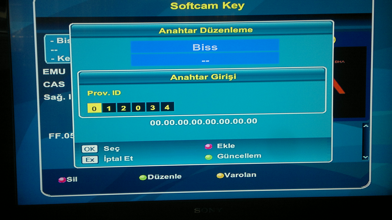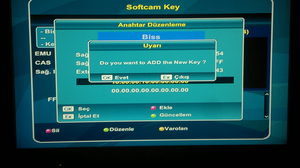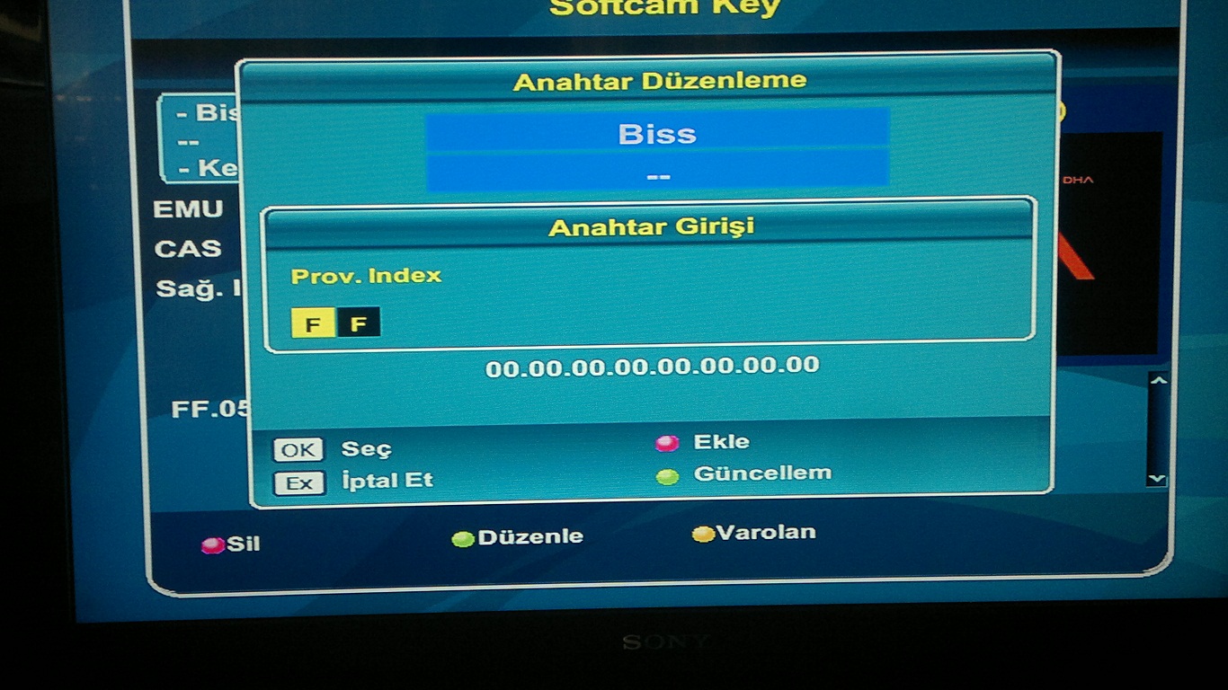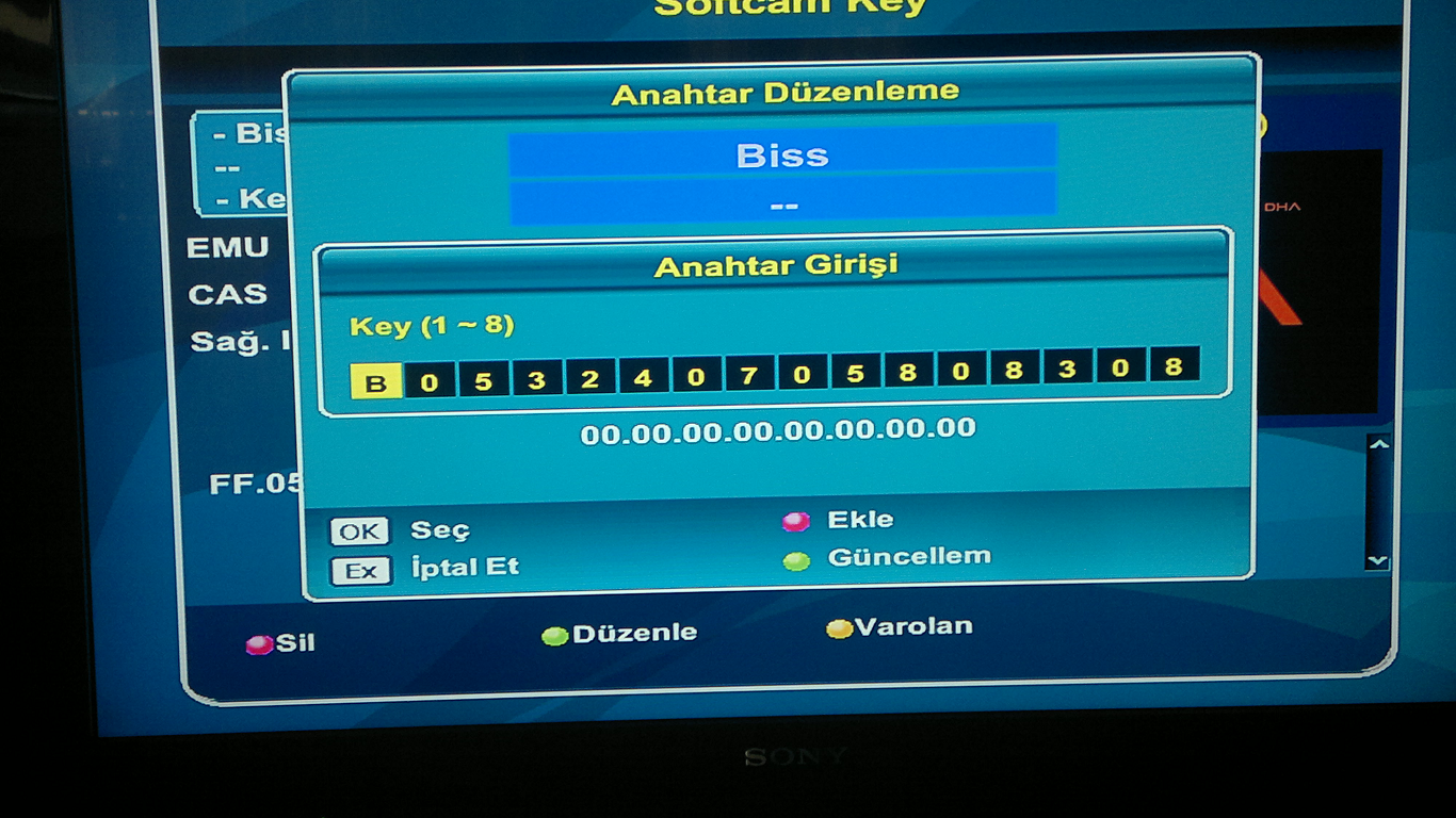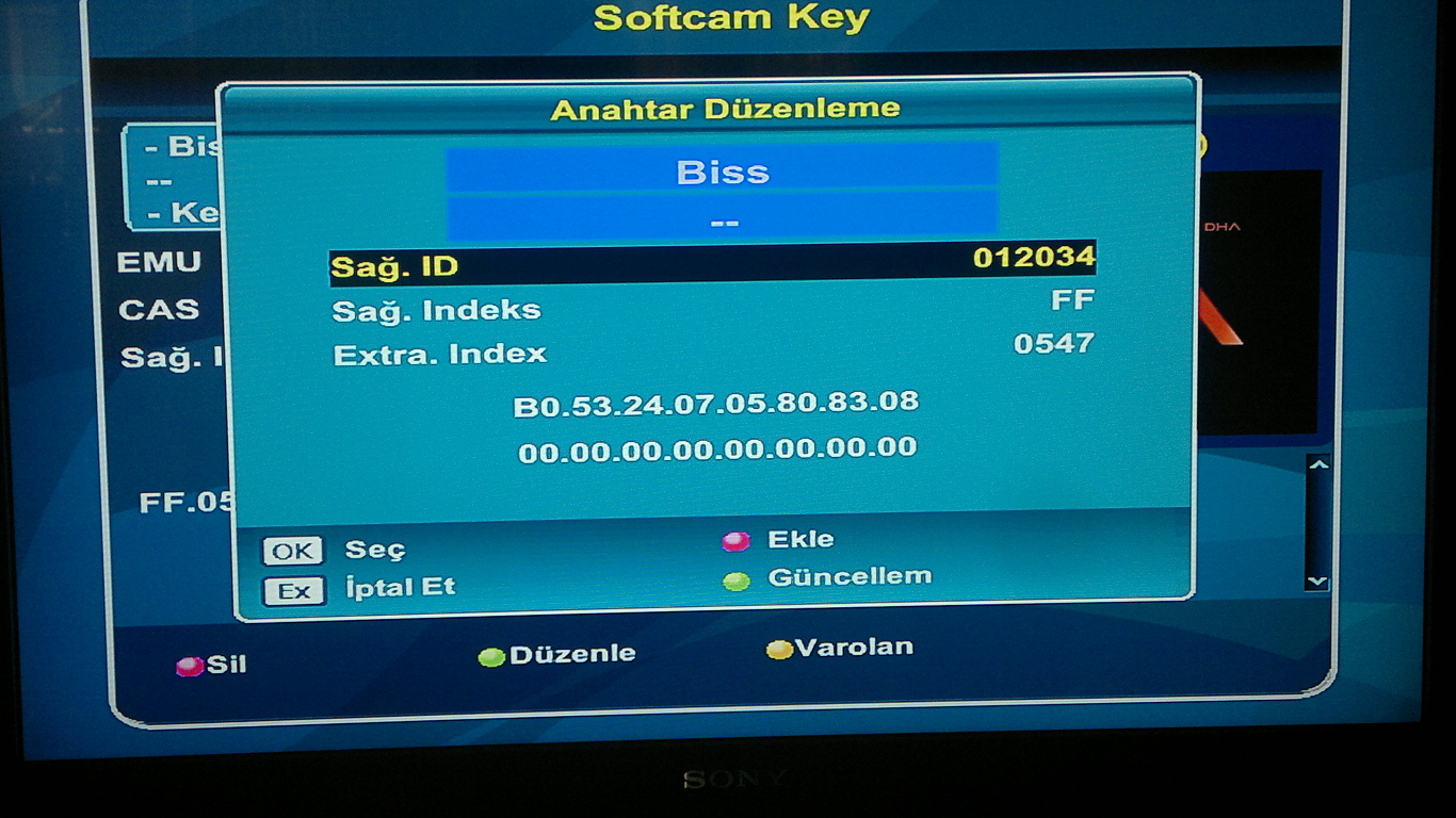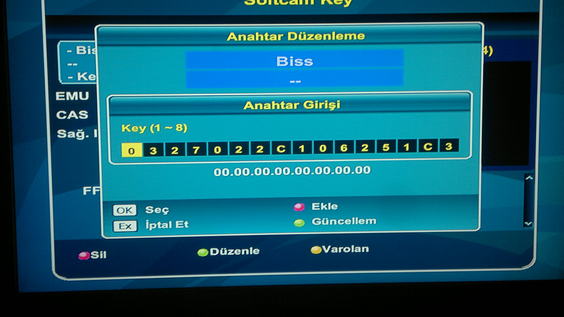 · Yeni biss key eklemek için; Menü, 2580, Düzenle (Yesil) , Sag. ID OK (Kanalin Frekansi) , Sag. Indeks OK (00, 01, FF, FE ya da FB) , Ekstra. Index OK (Kanalin Service identi. (SID) , Key OK ( Örnegin; 1000000000000000 ) , Ekle (Kirmizi) OK.