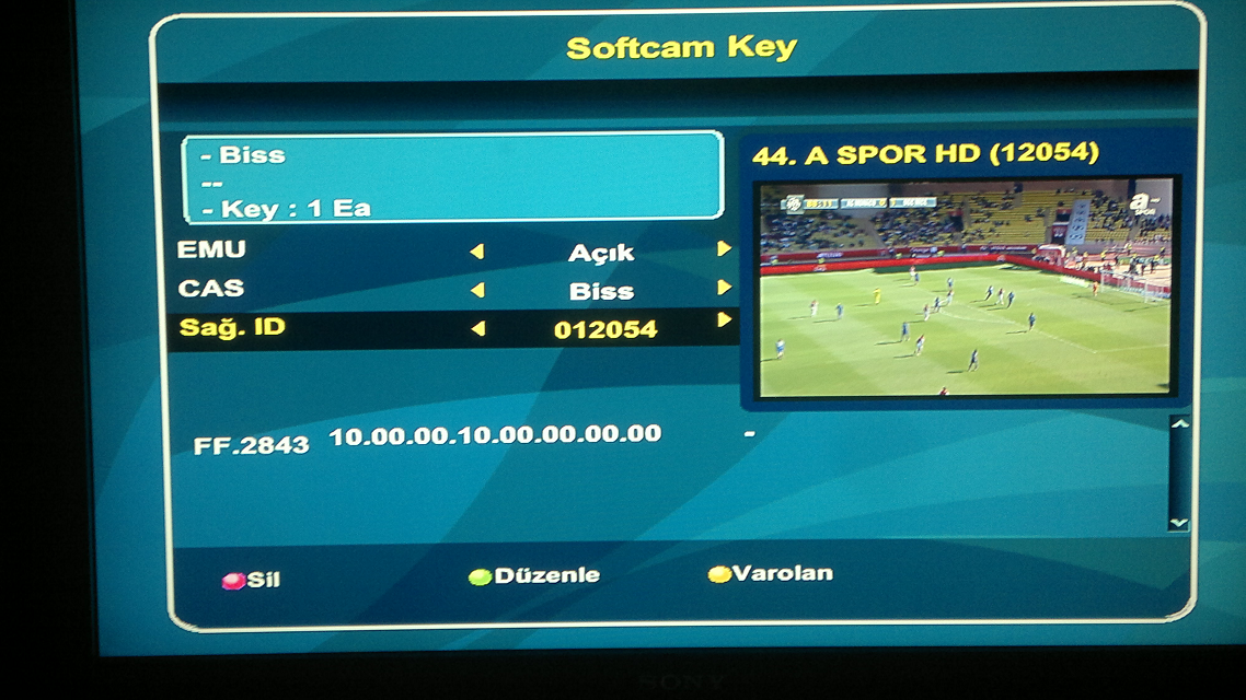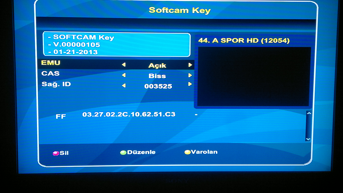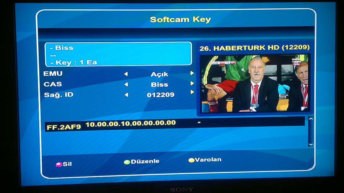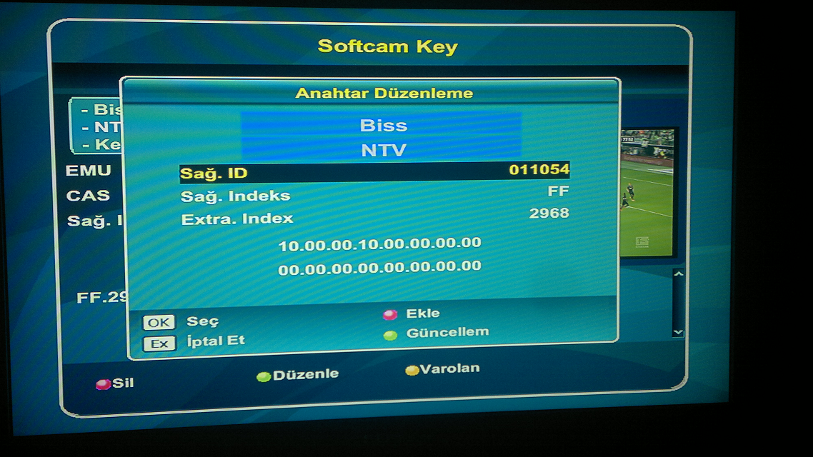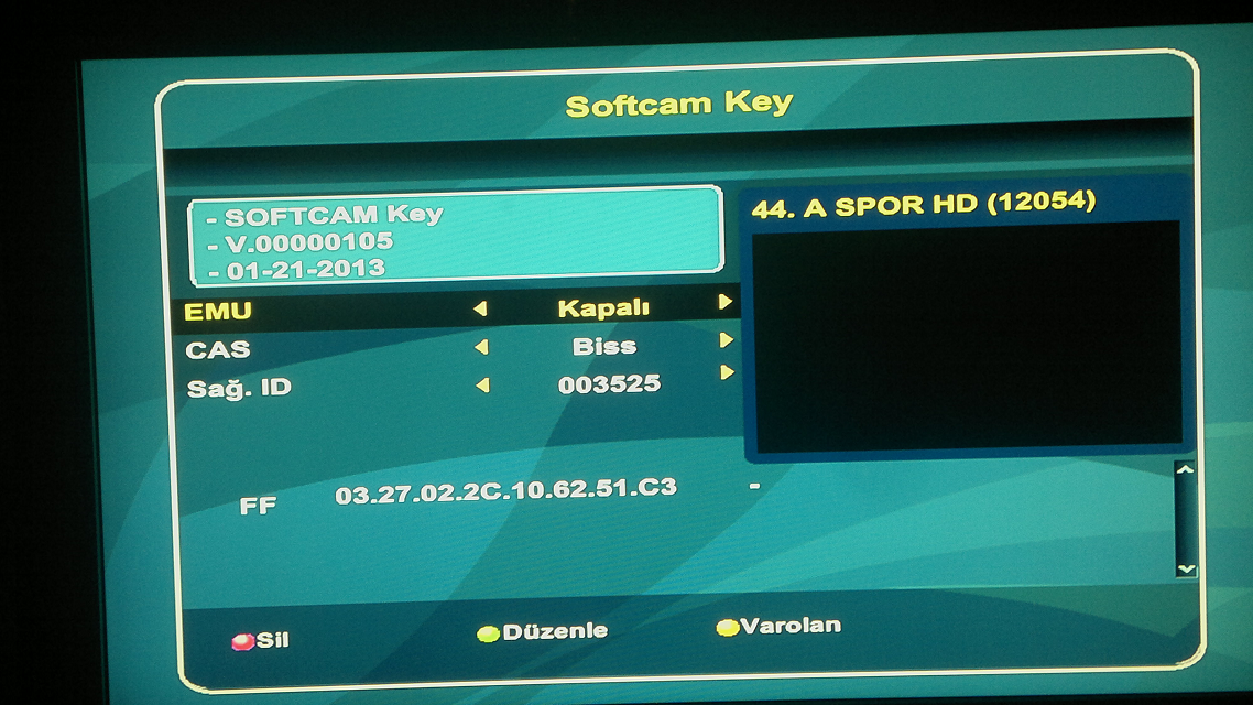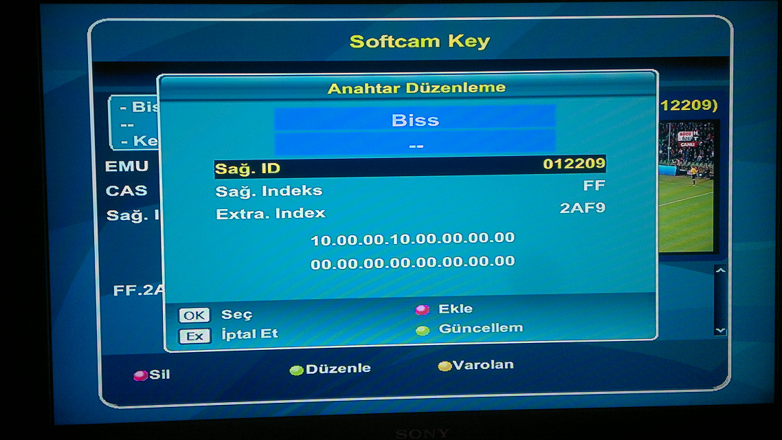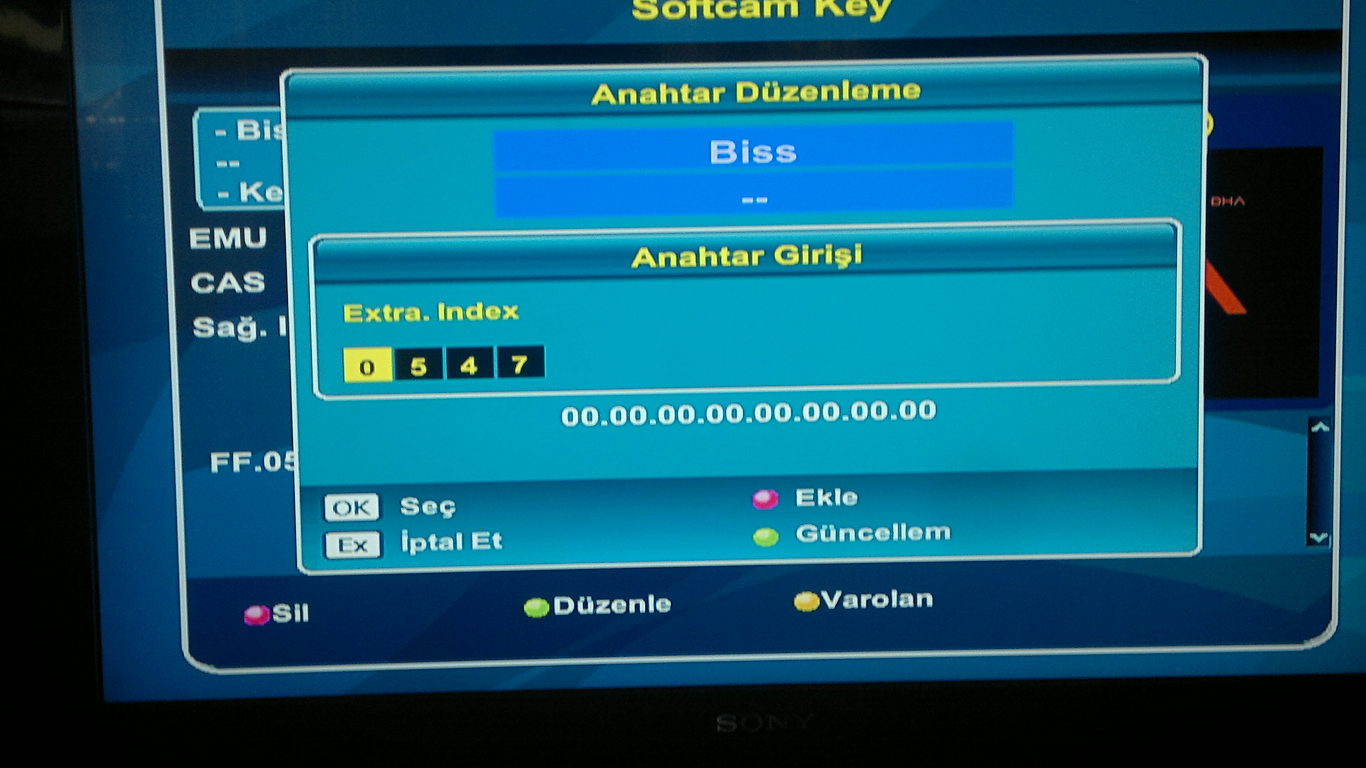 · Yeni biss key eklemek için; Menü, 2580, Düzenle (Yesil) , Sag. ID OK (Kanalin Frekansi) , Sag. Indeks OK (00, 01, FF, FE ya da FB) , Ekstra. Index OK (Kanalin Service identi. (SID) , Key OK ( Örnegin; 1000000000000000 ) , Ekle (Kirmizi) OK.