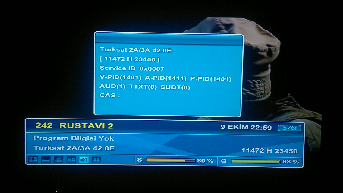 Service ID (SID) (Ekstra. Index) A spor SD 283E A spor HD 2843 ATV HD 2841 Haberturk SD 2BC0 Bloomberg HT 2BC1 SHOW TV HD 2AF8 Haberturk HD 2AF9 Star TV SD 2A30 NTV Türkiye 2A31 NTV Spor 2A32 TRT HD 2964 TRT 1 HD 2969 TRT Haber HD 296A TRT 1 SD 2904 TRT Haber SD 2905 TRT 3 Spor 2907 TV8 3264 TV8 int 0526 1 TV GEORGIA 0001 RUSTAVI 2 0007 DHA FEED 0547 |