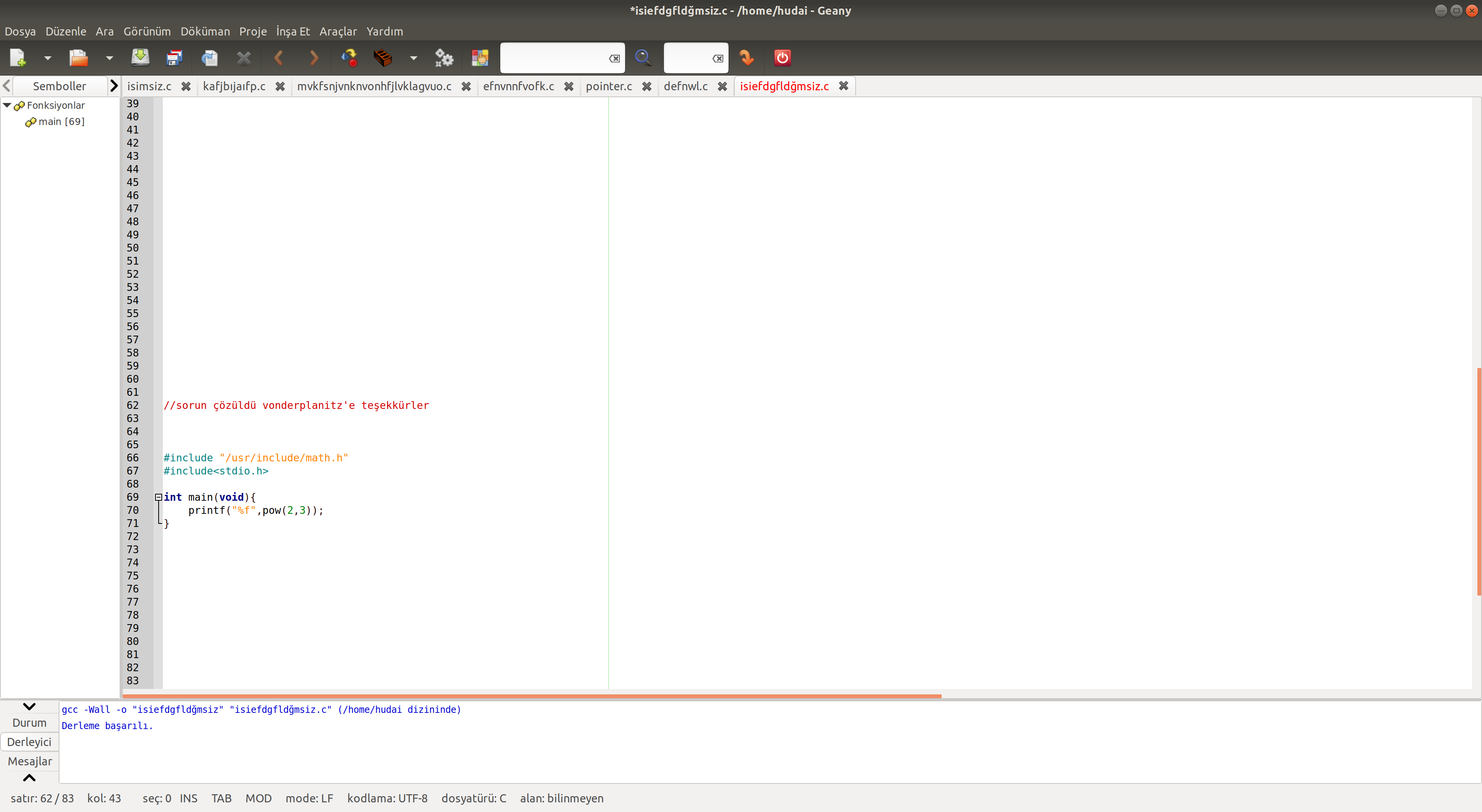 Linux kullanıyorum , ilk olarak codeblocks kullanıyordum ide olarak fakat pek sağlam değildi , geany e geçtim bu sefer de math.h kütüphanesini görmüyor, amatör bir kullanıcıyım basit bir çözüm önerisinde bulunabilir misiniz ?