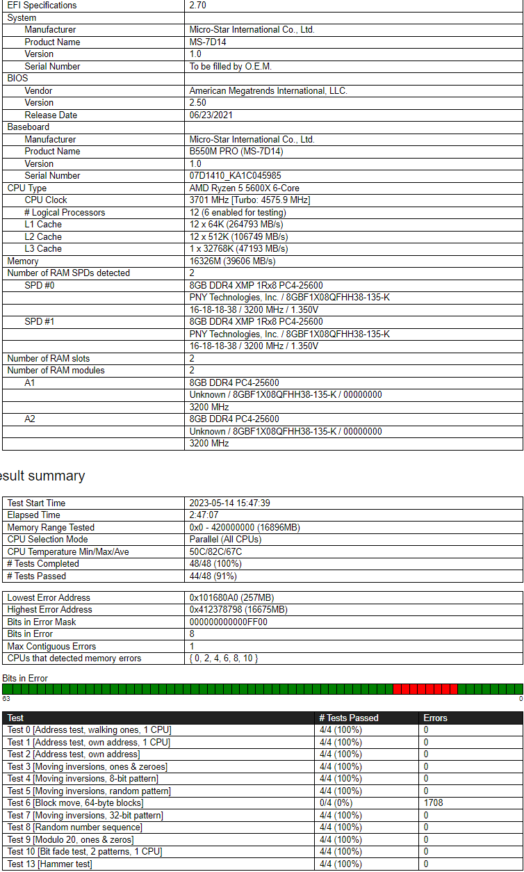 2023-05-14 16:23:03 - [MEM ERROR - Data] Test: 6, CPU: 8, Address: 135D9C650, Expected: 0000FF10, Actual: 00000010