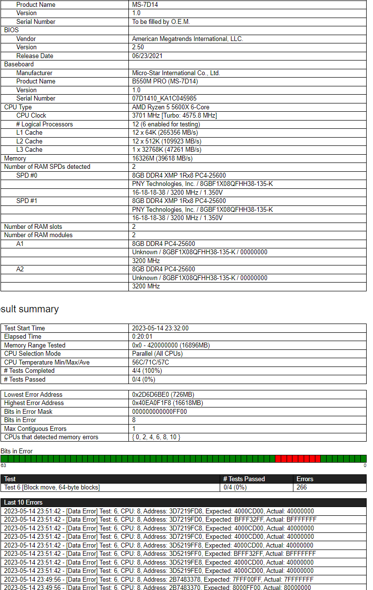 2023-05-14 16:23:58 - [MEM ERROR - Data] Test: 6, CPU: 10, Address: 1C1EA1638, Expected: 00005600, Actual: 00000400