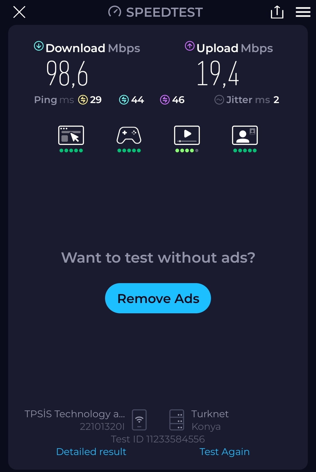Şu anda sorun çözülmüş görünüyor. Hızı tam alıyorum, ping ve jitter değeleri normal seviyelerinde ancak özellikle upload kısmında dalgalanmalar devam ediyor ve hız testlerinde de download kısmında da dalgalanmalar görmekteyim. Steam indirme hızım tam kapasitede indiriyor. Bu dalgalanmaların wifi bağlantısı sebebiyle olmasıda olası. Sonuç olarak dün akşam ölü bir internet vardı şimdi ise canlanmış vaziyette. Dilerim bir daha böyle büyük sorunlar yaşamayız, bu konuda önlemlerini almış olmalarını dilerim. Firmadan memnuniyetim devam etmekte kısa sürede çözüm sağlamış olmaları büyük artı kazandırdı. Firmayı tavsiye etmeye devam edeceğim ancak bir süre üye alımlarını durdurmalılar çünkü belli ki kapasiteleri doldu taştı.