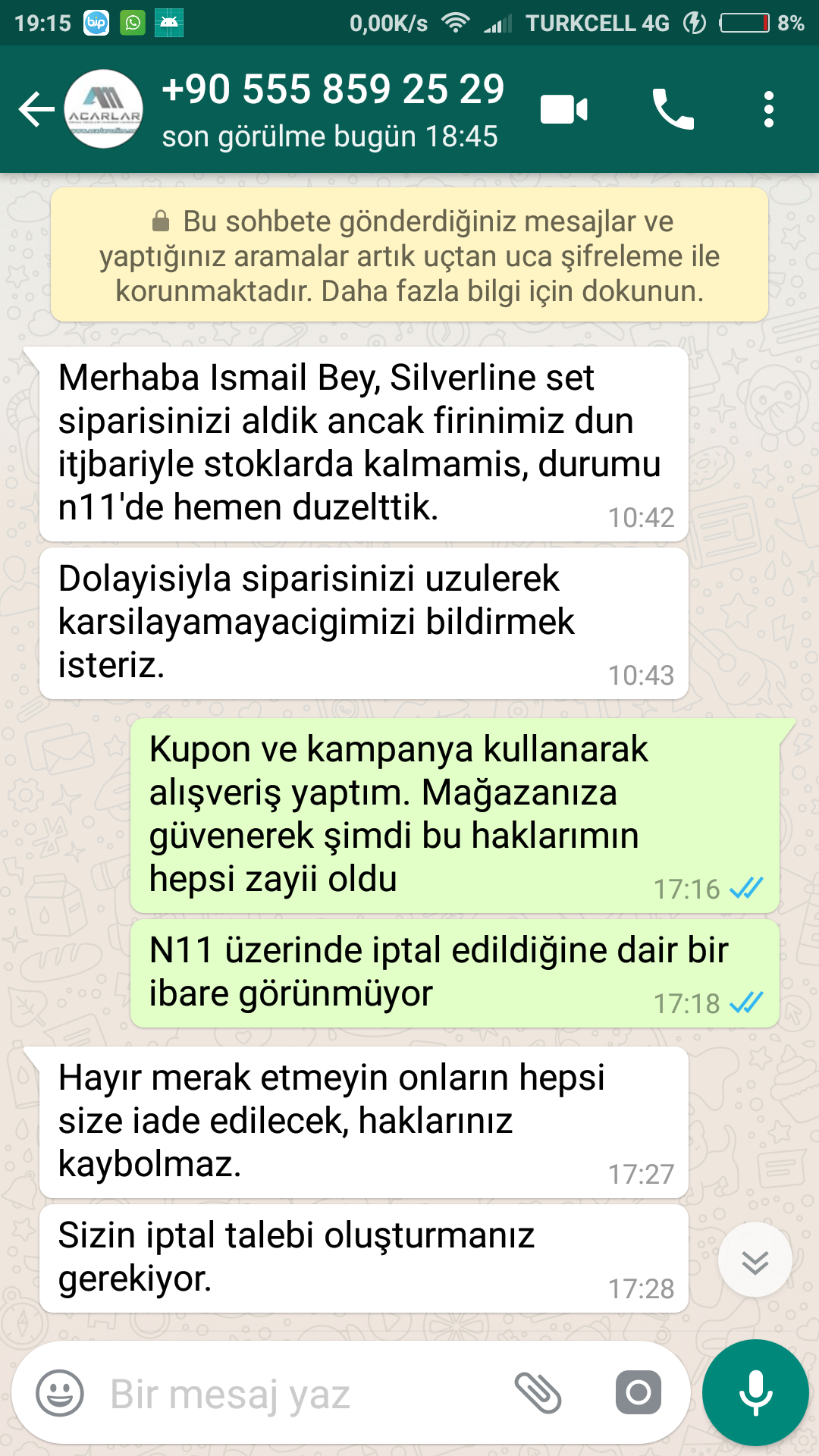 Ancak satıcı ürünün stoğunda olmadığına dair bana WhatsApp dan dönüş yaptı. Yazışmalarımızı aşağıya paylaşıyorum. < Resime gitmek için tıklayın >