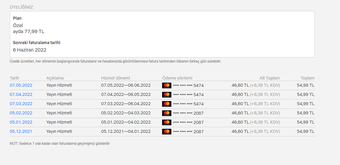 3+3 ay olarak uzattığımız 6 aylık grup yöneticisiyim ücreti aylık 14.5 3 aylık 43,5 tl olarak aldım. Bu da Netflix'e aylık ödemenin görüntüsü < Resime gitmek için tıklayın > |