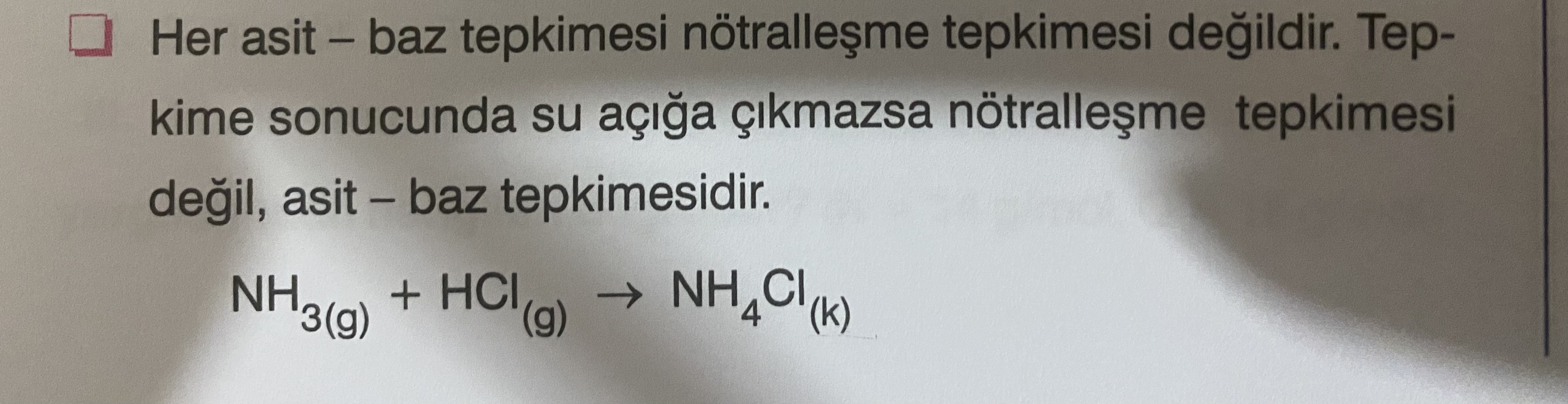 anladim hocam simdi sanirim ozet bu direkt seyi de unutmayalim tepkimede su cikmazsa notrallesme tepkimesi olmuyor asit-baz tep diyoruz |