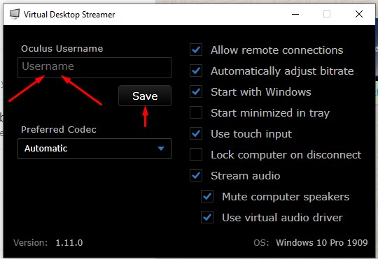 İndirmiş olduğumuz exe yi pc ye kuruyoruz. Ve oculus da kullanmış olduğumuz username yi gerekli yere yazıp save yi tıklıyoruz. Pc yi yeniden başlatıyoruz. Sonra virtual desktopu tekrar acıyoruz.