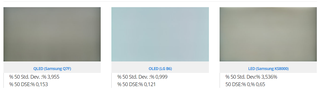 QLED vs OLED vs LED TV: Hangisi en iyisi? Televizyonlar için alışveriş yaparken, OLED TV'ler etkileyici performansları nedeniyle çok çekici görünüyor. Ancak 2017'de Samsung hem pahalı OLED TV'lere hem de daha ucuz LCD TV'lere alternatif sunan yeni QLED TV'lerini piyasaya sürdü. LED vs OLED vs QLED: Bu farklı teknolojiler nasıl karşılaştırıyor ve açık bir kazanan var mı? < Resime gitmek için tıklayın > QLED SAMSUNG Q7F QLED Nedir? QLED, Samsung tarafından yeni LED TV'lerini tanımlamak için kullanılan bir pazarlama adıdır. LED'ler kullanılarak aydınlatılan geleneksel LCD panelleri kullanıyorlar. LCD katman ve arka ışık arasında, enerji reaktif nano partiküllere sahip bir filtre, daha saf ve doygun renkler elde etmek için ışığı filtreler. Kimler satın almalı : Mevcut en iyi renkleri arayanlar. QLED TV incelememize göz atın OLED LG B6 OLED Nedir? OLED TV'ler, piksellerinin her birinin parlaklığını tek tek ayarlayabilen TV'lerdir. Bu onların tamamen kapanmasını ve saf siyahlar ve sonsuz kontrast göstermelerini sağlar. Bu onlara olağanüstü görüntü kalitesi sağlar. Bunu kim satın almalı : Hafif bir görüntü tutma ve parlaklıktaki değişiklikler bir anlaşma kırıcı olsa bile, bunu karşılayabilecek herkes. İncelediğimiz en iyi OLED TV'leri görün LED SAMSUNG KS8000 LED Nedir? LED "Işık Yayan Diyot" anlamına gelir. LED TV'ler LED'ler kullanılarak arkadan aydınlatmalı geleneksel LCD panellerdir. Son çıkan yüksek kaliteli LED TV'ler, QLED TV'ler gibi çok benzer bir ışık filtreleme düzlemi kullanır ve bu da geniş bir renk yelpazesi oluşturmasına yardımcı olur. Bunu kim satın almalı : Çoğu kişi bugün televizyon arıyor. LED TV'ler en iyi değeri sunar ve çok çeşitli boyutlarda bulunabilir. İncelediğimiz en iyi LED TV'leri görün < Resime gitmek için tıklayın > Karşılaştırma için, son QLED TV, Samsung Q7F, geçen yılki en iyi önerilerle eşleştirdik: LG B6 OLED TV ve Samsung KS8000 LED TV. KS8000, tesadüfen Q7F'nin yerini aldığı TV'dir ve B6 şu anki referans noktasıdır. Bu, QLED'in ilerlemelerini görselleştirmeye yardımcı olmalıdır. Siyah Seviye < Resime gitmek için tıklayın > Fotoğraflarda bunu görmek zor, ancak OLED'i her iki tipte LCD ile karşılaştırmak, bu kategoride ne kadar ileride olduğunu gösteriyor. Zifiri siyah bir odada, siyah tekdüzelik desenimizin üzerindeki çapraz, görünür olan tek şeydir. Ekranın siyah kısımlarının hiçbiri herhangi bir ışık yaymaz ve tamamen siyah görünürler. Test ettiğimiz en yüksek kontrastlı LED TV'lerden biri olan KS8000 ile kıyaslandığında fark edilebilir bir fark var. Çevredeki siyah alanlar çok karanlık olsa da, hala yanar ve biraz daha gri görünürler. IPS gibi düşük kontrastlı TV'ler kadar kötü değil , ancak OLED ile karşılaştırıldığında fark büyük. Anlaşıldığı üzere, QLED bu kategorideki en iyi LED'lerden daha kötü oluyor. Kötü kontrast oranından uzak olsa da, LCD tipi televizyonlar ve OLED'ler arasındaki boşluğu daha da genişletir. Bazı LED TV'lerde , bu sorunlara çok yardımcı olan çok gelişmiş yerel karartma özellikleri bulunur , ancak en iyi yerel karartma bile OLED TV'ler kadar iyi ve düzgün bir siyah seviye üretmez. Kazanan: OLED Siyahlar ve kontrast oranı hakkında daha fazla bilgi edinin Hareket Bulanıklığı < Resime gitmek için tıklayın > Farklı ekranlara baktığınızda, hareketli görüntülerin her televizyonda farklı şekilde tepki verebileceğini fark edebilirsiniz. Bunun en büyük nedeni cevap verme süresidir. LCD paneller bir renkten diğerine geçmek için zaman alır ve bazıları diğerlerinden daha hızlıdır. Bir pikselin durumu değiştirmesi için gereken süre, hareketli nesneyi takip etmenin yolunu açar. Bazı televizyonlar diğerlerinden daha kötüdür ve tepki süresi özellikle kötü olduğunda, bir aksiyon sahnesi bulanık bir karmaşaya dönüşebilir. OLED TV'ler, resimlerden de görebileceğiniz gibi, bu problemi yaşamamaktadır. Piksellerin her biri durumu hemen hemen değiştirebilir, bu yüzden geride iz kalmaz. Bu nedenle, OLED TV'lerin hareket bulanıklığına sahip olmadığını düşünüyoruz. Ancak farklı LED TV'ler değişecektir. Gördüğünüz gibi Q7F, selefinden çok daha iyi performans gösteriyor, KS8000. Pikseller bir durumdan diğerine iki kat daha hızlı geçiş yapabilirler, böylece elde edilen görüntü çok daha temizdir. Bazı insanlar için, OLED ekranların olağanüstü küçük miktarda hareket bulanıklığı bir dezavantaj olabilir. Filmler gibi alt kare içeriği, kareler birbirine uymadığı için sıralı görünebilir. Konu hakkında daha fazla bilgi için TV'de Motion hakkında videomuza göz atın . Özünde, bir TV'deki hareketin kalitesi, bir şeyden diğerine geçerken piksellerin hızı ile tanımlanır. Bazı durumlarda bu bazı kişiler tarafından tercih edilmese de, sporda, video oyunlarında ve TV yayınlarında OLED TV'lerin çok daha hızlı tepki süresi büyük bir avantajdır. Kazanan: OLED Hareket bulanıklığı hakkında daha fazla bilgi edinin Görüş Açısı < Resime gitmek için tıklayın > Görüş açısı söz konusu olduğunda, Samsung QLED'i diğer LED TV'lerle karşılaştırıldığında önemli bir yükseltme olarak nitelendirdi. Ne yazık ki, bu konuda herhangi bir gelişme ölçmedik. Samsung'un QLED TV'leri öncekilerle neredeyse aynı şekilde çalışıyor ve bu çoğu LCD TV'nin en düşük seviyesinde. Şimdi, tüm LED TV'lerin aynı küçük bakış açıları yok, IPS tipi televizyonlar genellikle oldukça iyi olacak. Her iki durumda da, ne QLED ne de en iyi LED TV'ler, OLED ekranların görüntüleme açısına uymaz. Kazanan: OLED İzleme açısı hakkında daha fazla bilgi edinin Renk Hacmi < Resime gitmek için tıklayın > Renk performansı, diğer TV'lerle karşılaştırıldığında yeni QLED TV'lerde gör